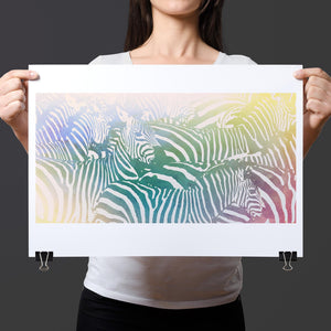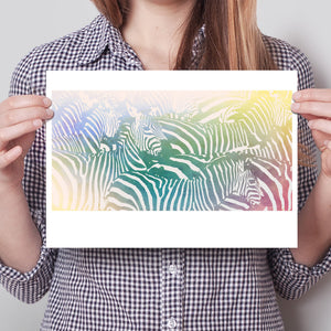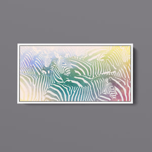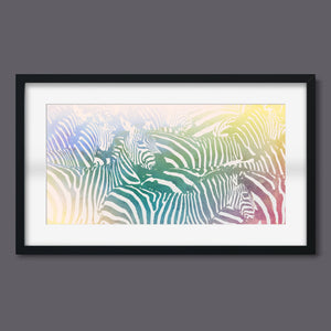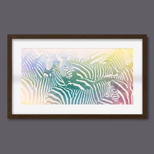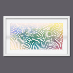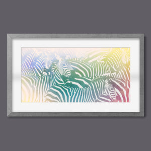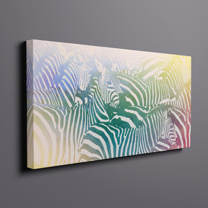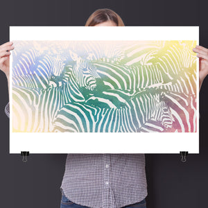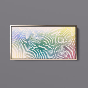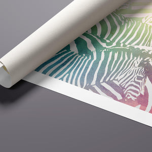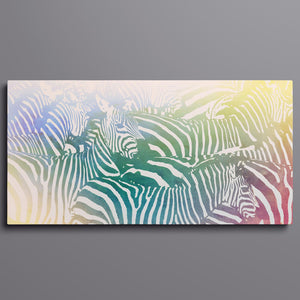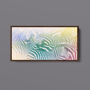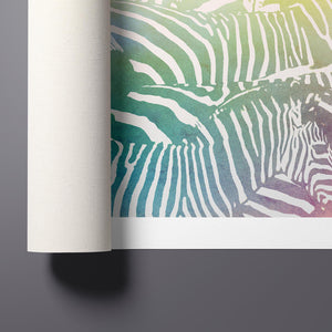 "Watercolor Zebra" is a vibrant and captivating artwork that celebrates the beauty of wildlife through a colorful and abstract lens. This horizontal piece features a striking zebra rendered in a delightful blend of yellow, blue, and green hues, creating a harmonious gradient that breathes life into the classic black-and-white stripes. The artistic brushstrokes evoke a sense of movement and texture, transporting viewers to the savannah where this majestic creature roams. Ideal for nature enthusiasts, this illustration captures the essence of the wild in a fresh, contemporary style.