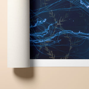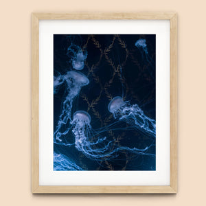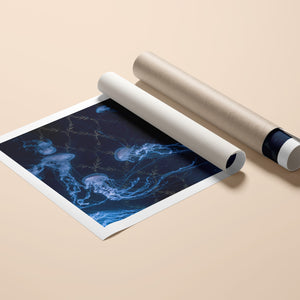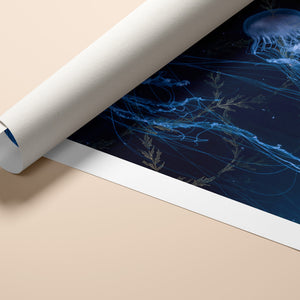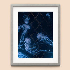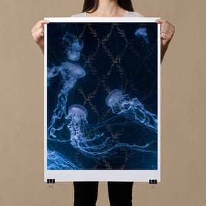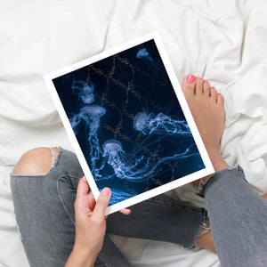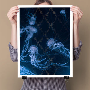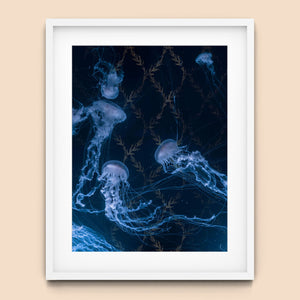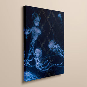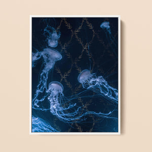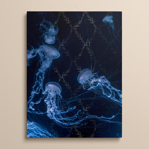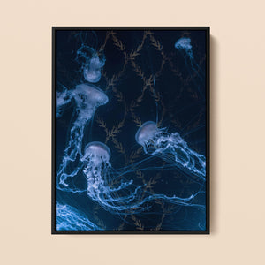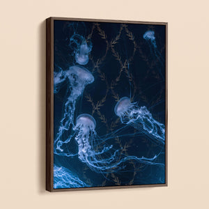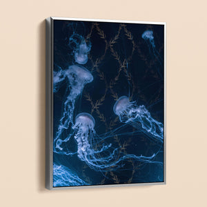 "Embroidered Jellyfish" is a striking piece of abstract contemporary art that delves into the beauty of marine life. This vertical artwork (3x4) features elegant jellyfish floating gracefully through an aquatic landscape. The use of navy and deep blue tones creates a mesmerizing contrast against the dark background, enhancing the glowing, translucent quality of the jellyfish. The intricate patterns and delicate details of the tentacles evoke a sense of ethereal beauty and serene underwater movement. The artwork combines modern aesthetic with a touch of nautical mystery, making it a captivating addition to any contemporary space.
