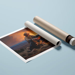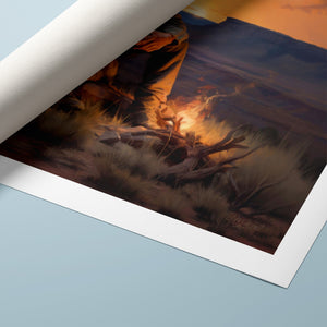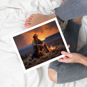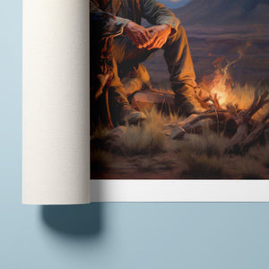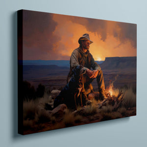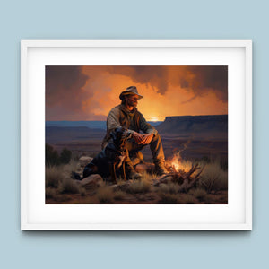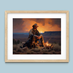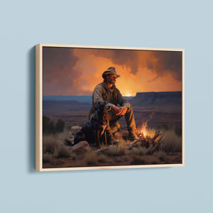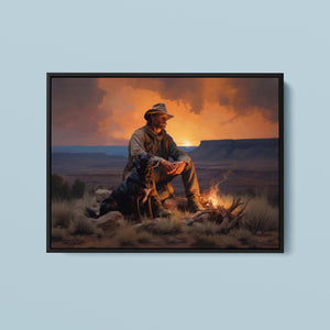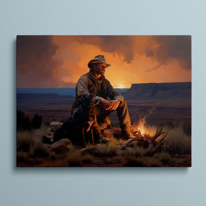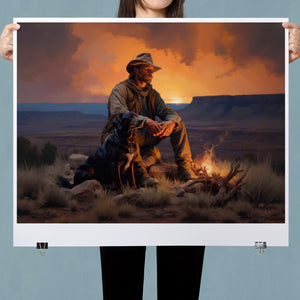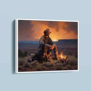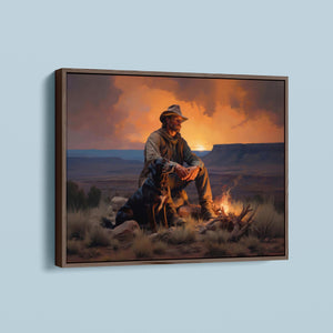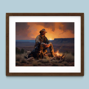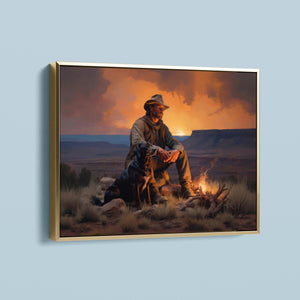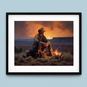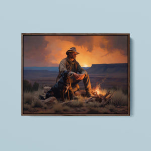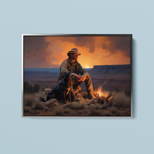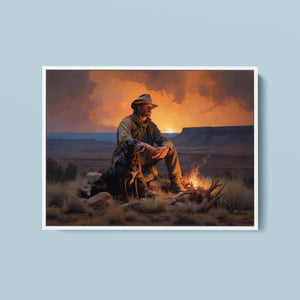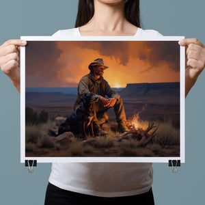 Fading Fire Light - Cowboy and Dog by the Campfire at Sundown