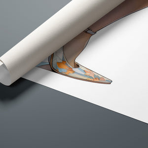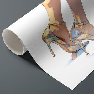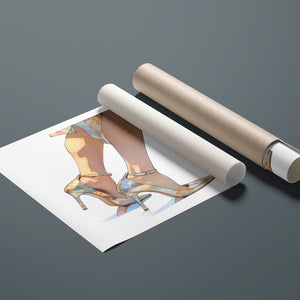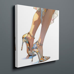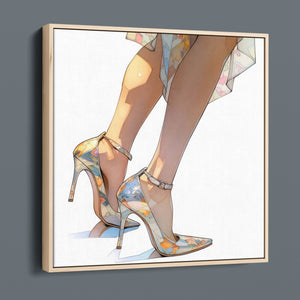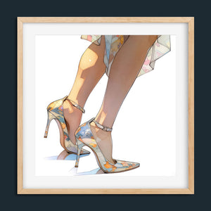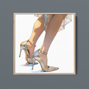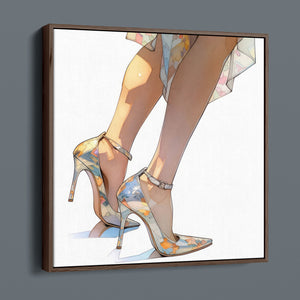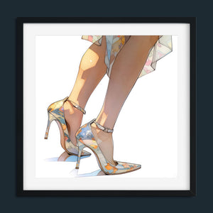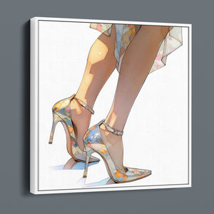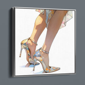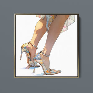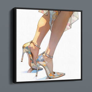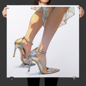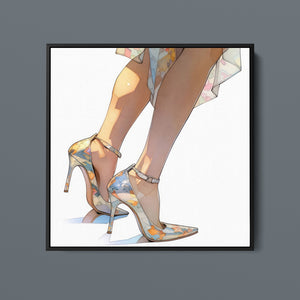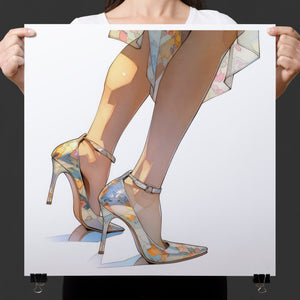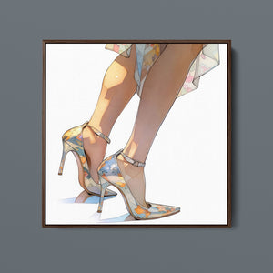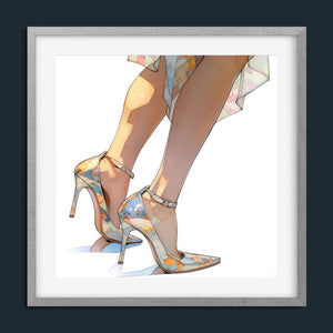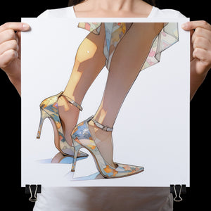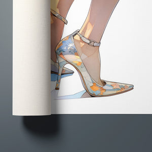 Embrace elegance and style with this chic illustration of women’s high heels. Featuring a sophisticated beige and silver palette, this artwork showcases trendy stilettos with a stylish floral pattern and ankle strap. The modern, dressy design captures the essence of summer fashion and femininity, making it a perfect piece for those who appreciate high fashion and sophisticated accessories. With its detailed print and fashionable flair, this illustration adds a touch of glamour to any space.