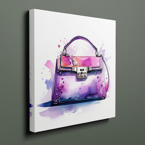 Watercolor illustration of a handbag in pink and purple tones with expressive splatter effects, combining elegance and trendy fashion design in a vibrant, artistic way.