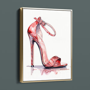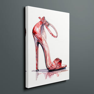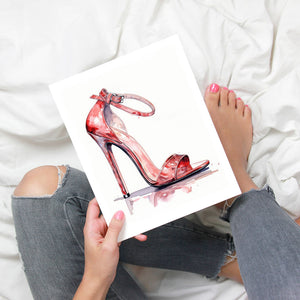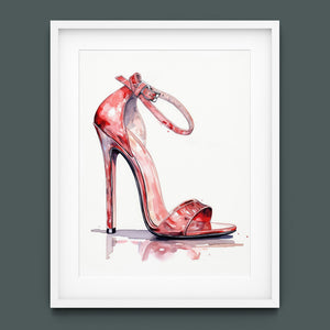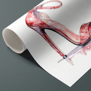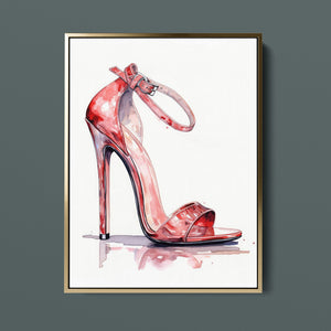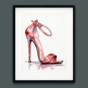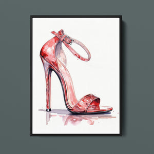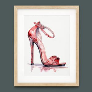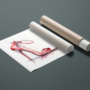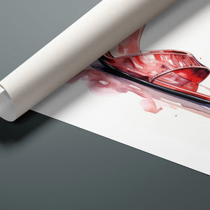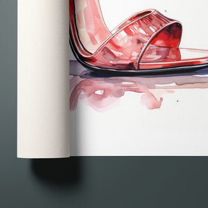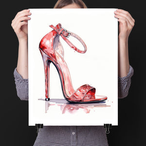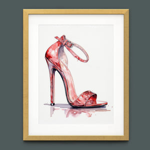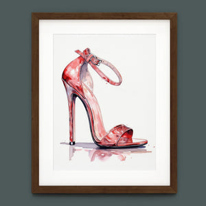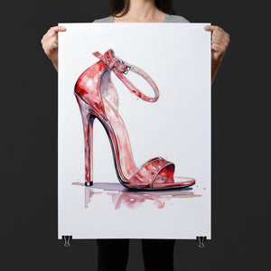 Explore the "Fashion Watercolor Stiletto - Red," a striking illustration of an elegant red high-heel with an ankle-strap and glossy finish. This chic artwork blends sophistication and glamour in a watercolor design.