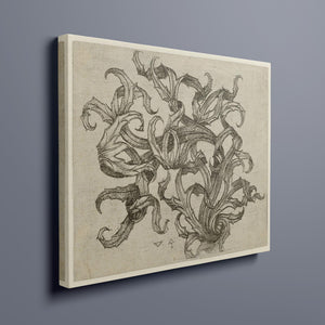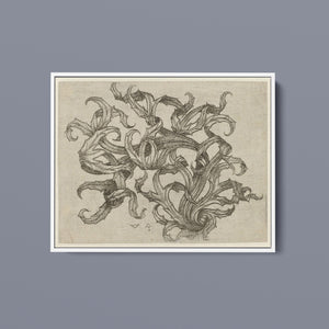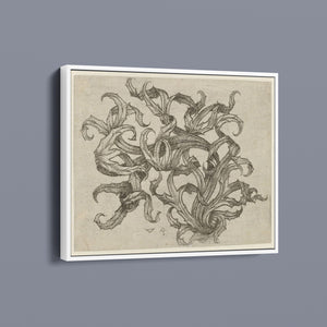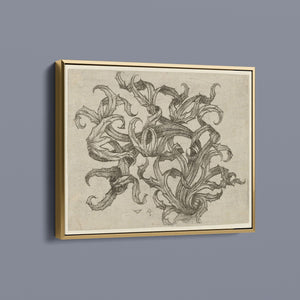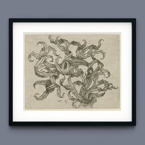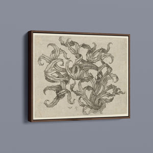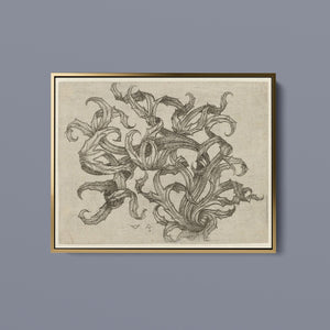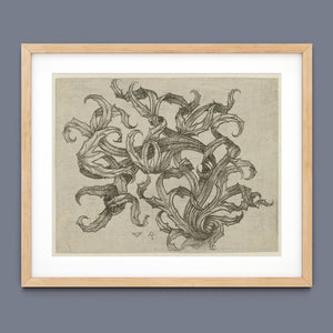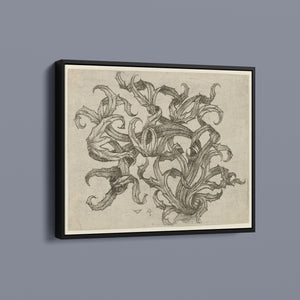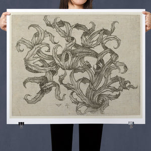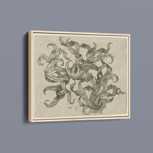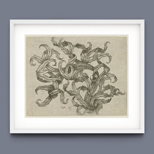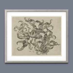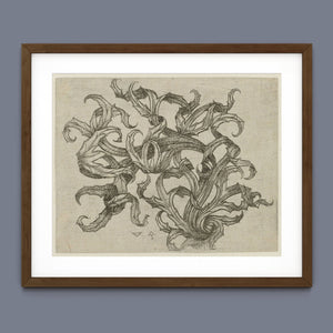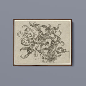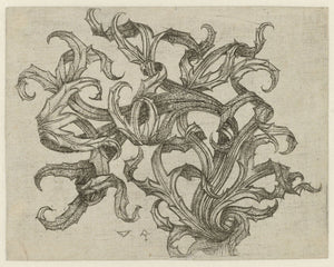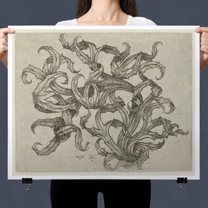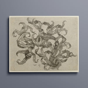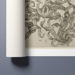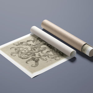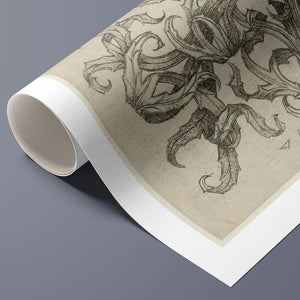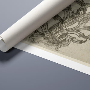 "Vintage Filigree" is a beautifully intricate etching that exemplifies classic decorative art with its elaborate baroque patterns and elegant design. Created in a sepia monochrome palette, this artwork features a range of swirling lines, ornate shapes, and delicate botanical elements such as acanthus foliage and organic curls. The vintage aesthetic is enhanced by the textured paper and the meticulous craftsmanship visible in every detail. The design's abstract quality and intricate filigree patterns highlight the artist's creativity and skill, making it a stunning representation of vintage artistry. This piece not only serves as a striking decorative element but also as a testament to the timeless beauty of traditional etching techniques and classic design.