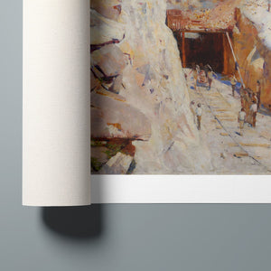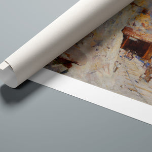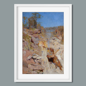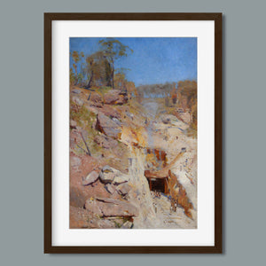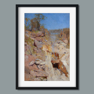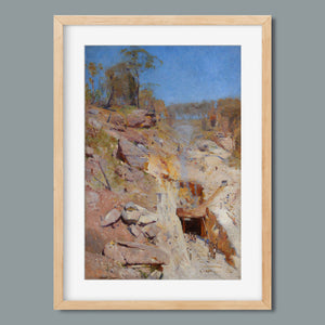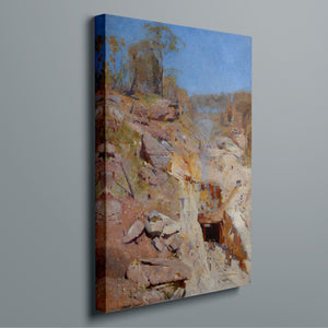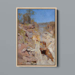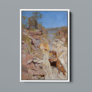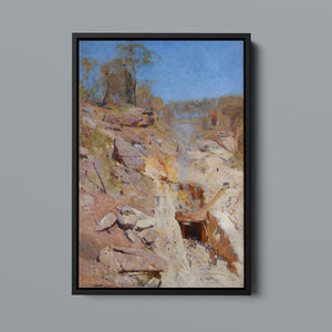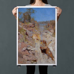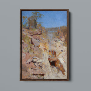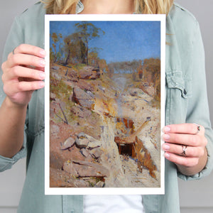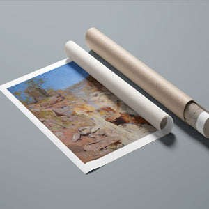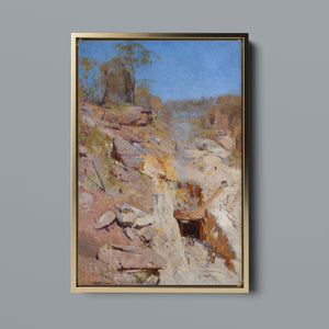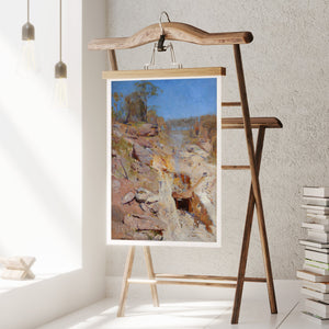 "Fire's On" by Arthur Streeton captures the dramatic and intense scene of a bushfire in the Australian outback. This vertical painting, rendered in classic impressionist style, showcases the effects of the fire on the landscape with rich hues of beige, brown, and blue. Streeton's depiction of eucalyptus trees shrouded in smoke under a blue sky highlights the natural disaster's impact during the 19th-century gold rush era. The artwork reflects the heritage and national identity of Australia, conveying the heat and peril of the bushfire with evocative brushwork and a vivid portrayal of the Australian outback.