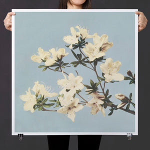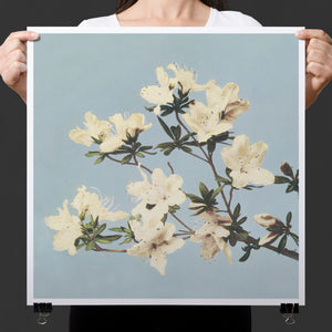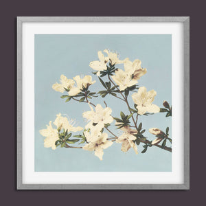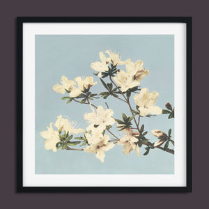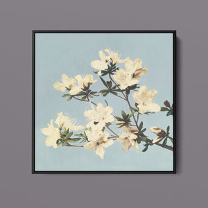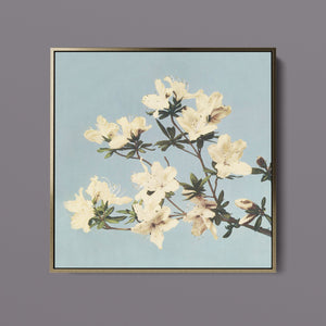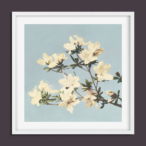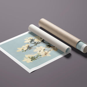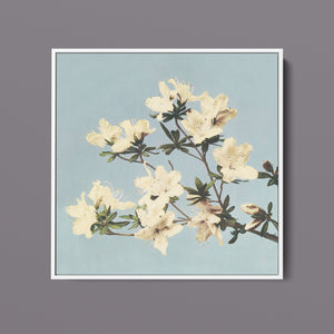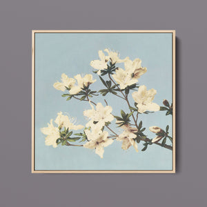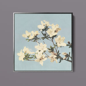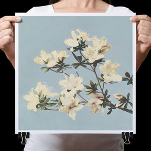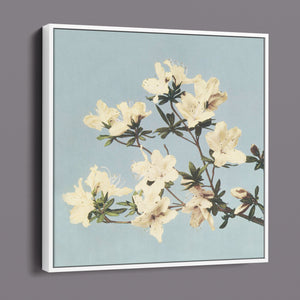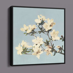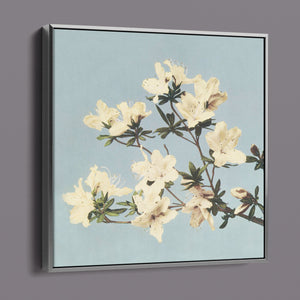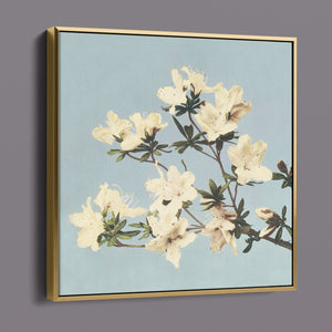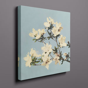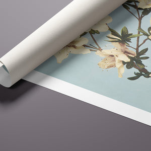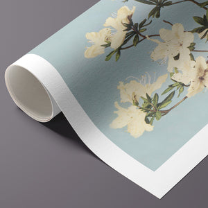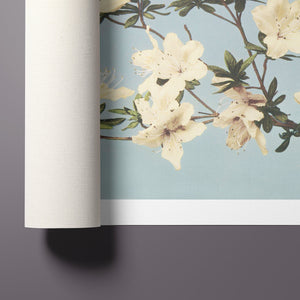 "Floral Block Print - Blue" is a classic botanical artwork showcasing delicate azaleas in a serene pastel blue background. This vintage piece captures the essence of blooming flowers with intricate details and a peaceful elegance. The artistic composition highlights the natural beauty of spring, featuring soft hues of blue and pale yellow that evoke a sense of calm and retro charm.