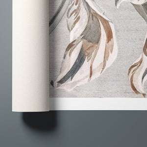 Vintage botanical illustration "Floral Block Print - Pink" with delicate floral patterns in muted pink, gray, and white, featuring detailed textures and naturalistic elements.