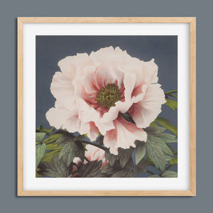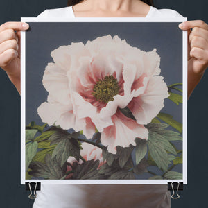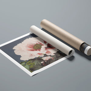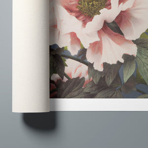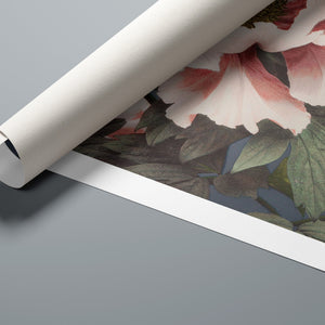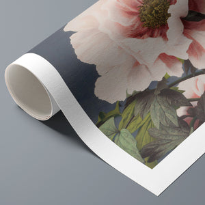 "Floral Block Print - Rose" is a timeless botanical artwork that showcases elegant pink and white roses in full bloom. The piece features detailed petals and lush, vibrant blossoms against a subtle gray and white background. This vintage print captures the serene beauty and delicate charm of nature, making it an ideal decorative element for enhancing any space with classic floral elegance.