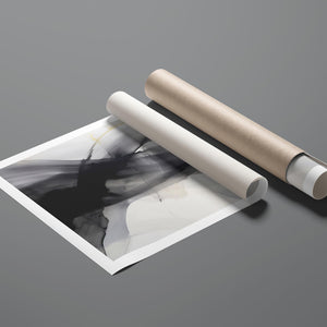 Contemporary abstract artwork showcasing fluid motion in black, white, and gray, with dynamic swirls and a minimalist design that evokes elegance and tranquility.