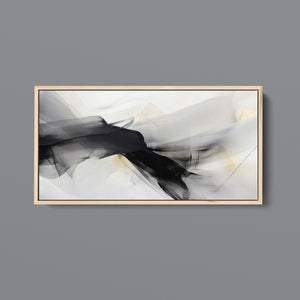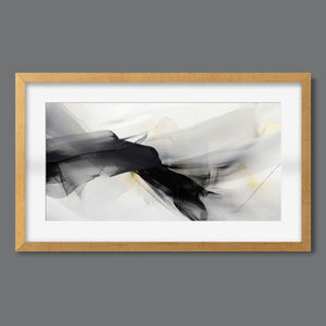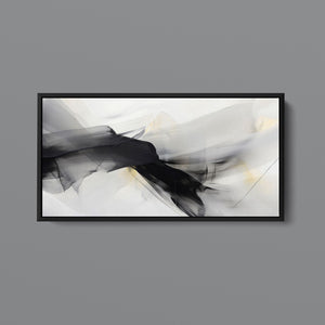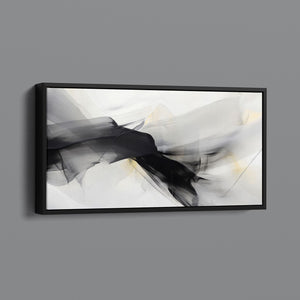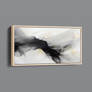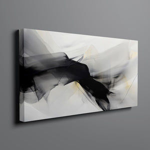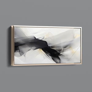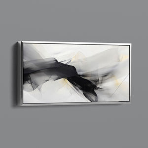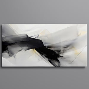 Contemporary abstract art featuring flowing waves and soft gradients in black, white, and gray, enhanced by subtle silver and gold highlights, creating an ethereal sense of motion and tranquility.