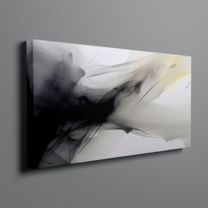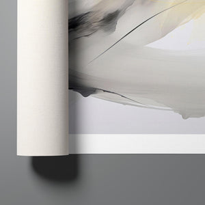 Contemporary abstract art showcasing graceful swirls and soft gradients in black, white, gray, and subtle yellow, evoking fluid motion and ethereal elegance.