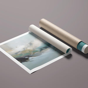 Contemporary abstract painting featuring soft aquamarine, white, and taupe tones, capturing the essence of ocean waves and serene coastal beauty.