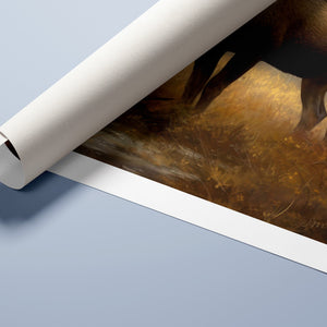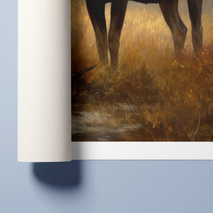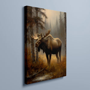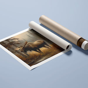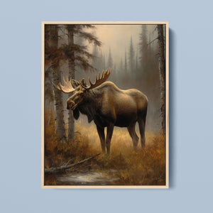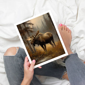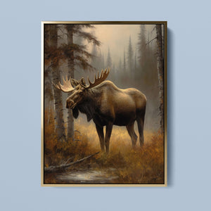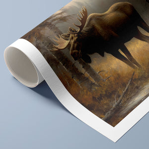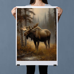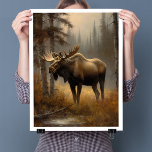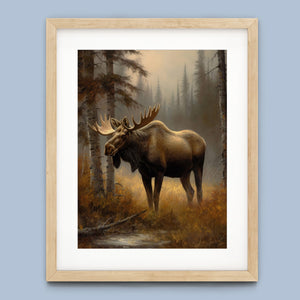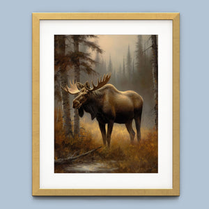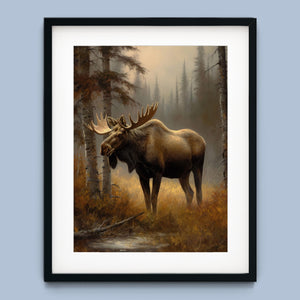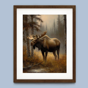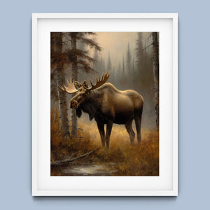 "Forest Forager" captures the tranquil majesty of a moose as it roams through a misty, enchanting forest bathed in warm autumn light. This piece blends the timeless beauty of nature with the evocative style of Western wildlife art, making it a stunning addition to any collection.