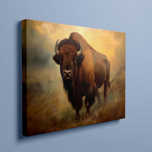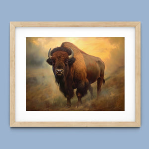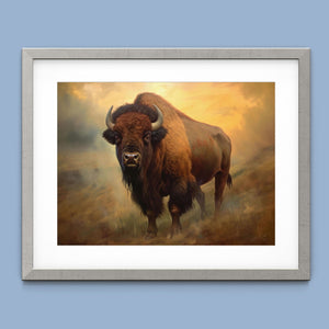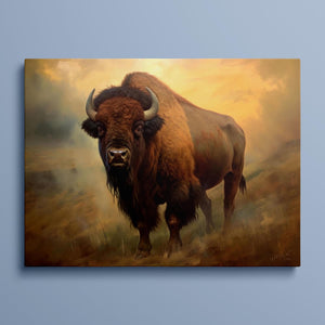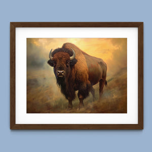 Painting of a majestic buffalo on a hillside in the Rocky Mountains, showcasing the grandeur of Western wildlife with warm, golden tones and a rugged, natural backdrop.