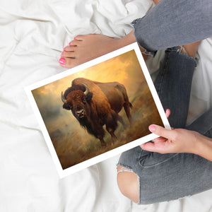 "Gold Dust" portrays a buffalo standing proudly on a hillside amidst the Rocky Mountains. This classic painting captures the essence of Western wildlife with its depiction of the buffalo's majesty and the picturesque, golden-hued landscape of the great outdoors.