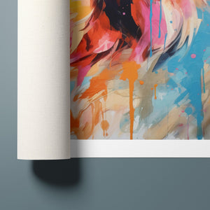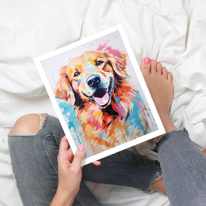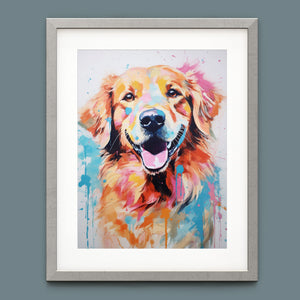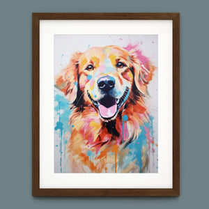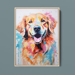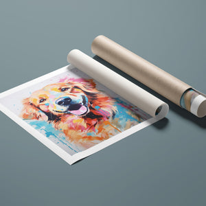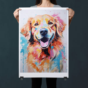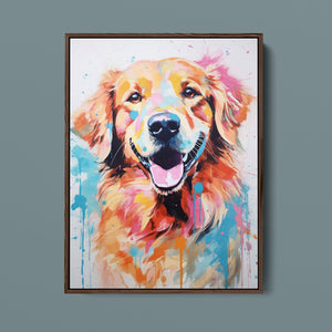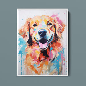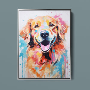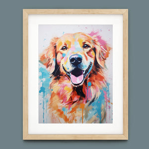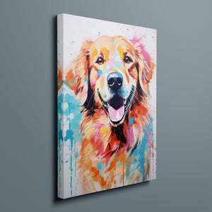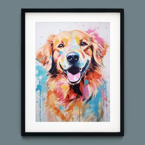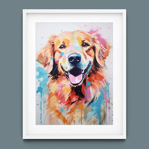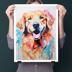 Golden Retriever - Bold Colorful Happy Puppy showcases a vibrant and cheerful portrait of a golden retriever. The artwork uses energetic brush strokes and bright, abstract splashes of color to convey the dog's joyful expression and playful nature. The dynamic use of dripping paint and vivid hues highlights the warmth and positivity of this beloved pet, making it a lively and engaging piece of art.