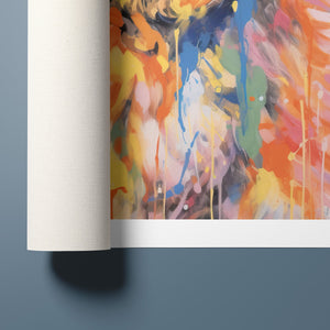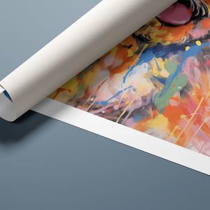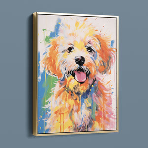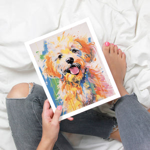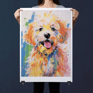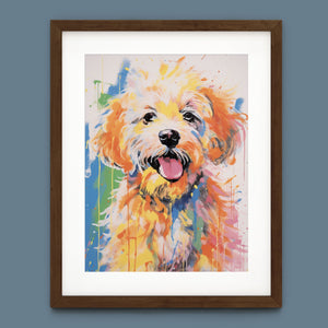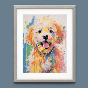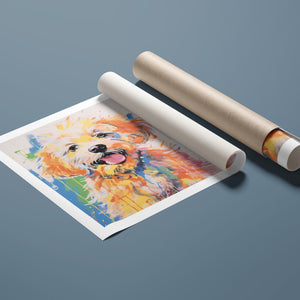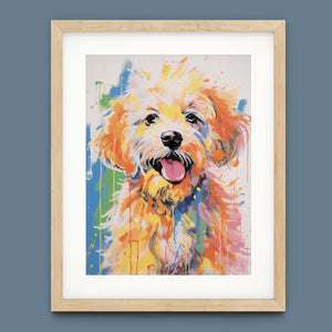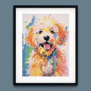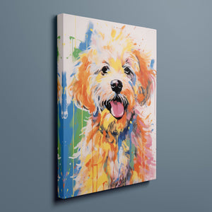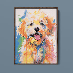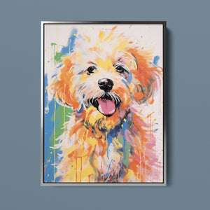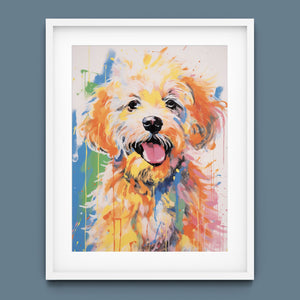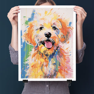 Goldie - Bold Colorful Happy Puppy presents a lively, abstract portrait of a golden retriever. The artwork highlights the dog's cheerful and playful nature with vibrant splashes of color and dynamic brush strokes. The use of dripping paint and bright hues captures the dog's youthful energy and joyful expression, making it a lively addition to any art collection.