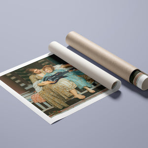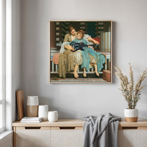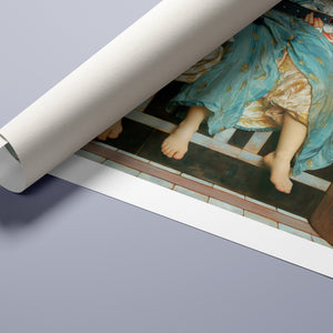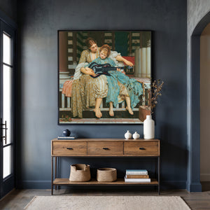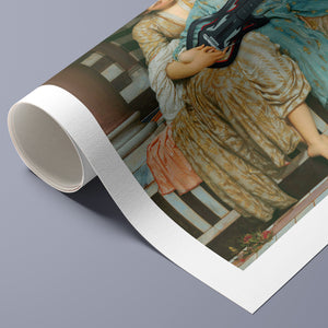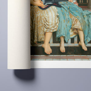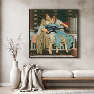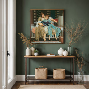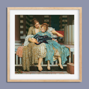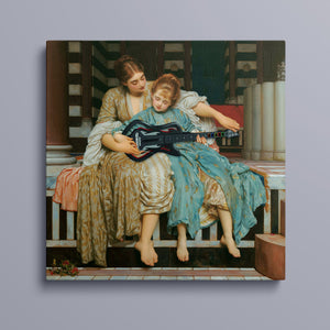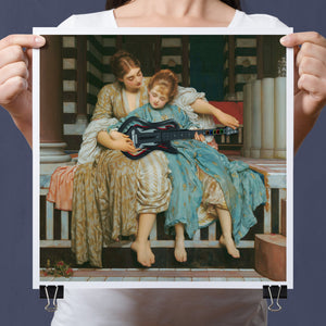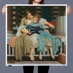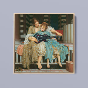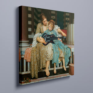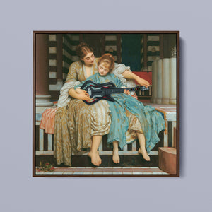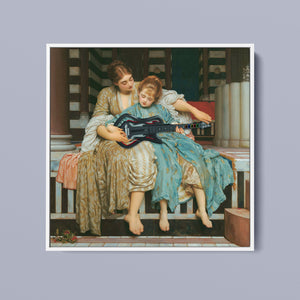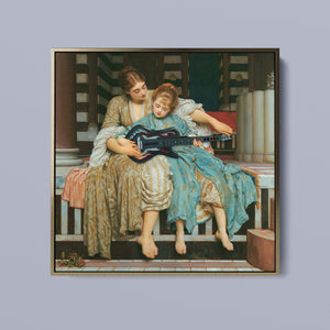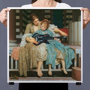 "Guitar Hero Music Lesson" by Frederic Leighton (1877) captures an intimate moment between a teacher and student in a classical setting. The vintage painting highlights the beauty of traditional music instruction with serene drapery, warm colors, and neoclassical architecture, embodying creativity and mentorship in a tranquil atmosphere.