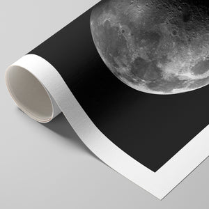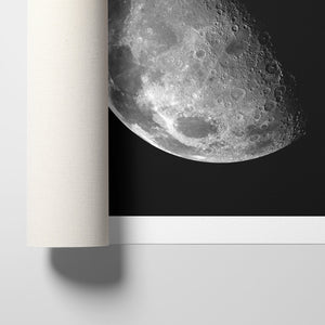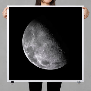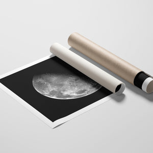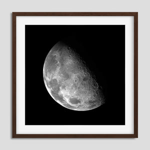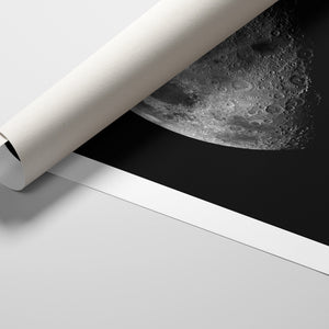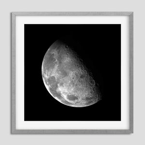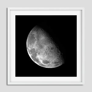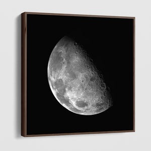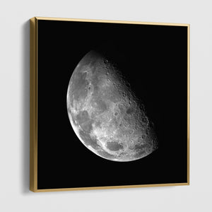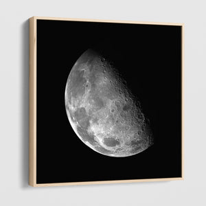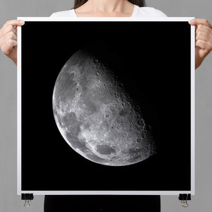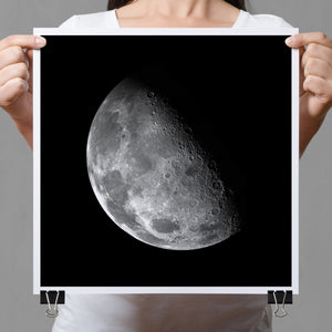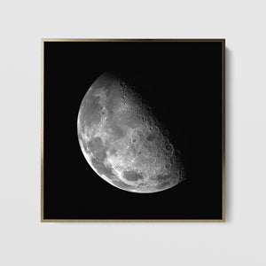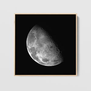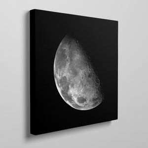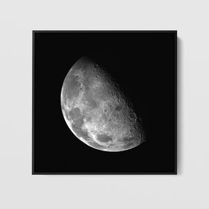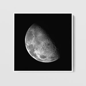 "Half Moon" offers a striking monochrome depiction of the lunar surface, capturing the tranquil beauty of the moon in its waxing gibbous phase. With detailed textures highlighting craters and the rugged terrain, this astrophotography artwork evokes the serene vastness of the night sky. The dark background emphasizes the moon's celestial presence, making it a captivating addition for those fascinated by astronomy and the cosmos.