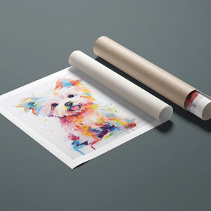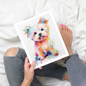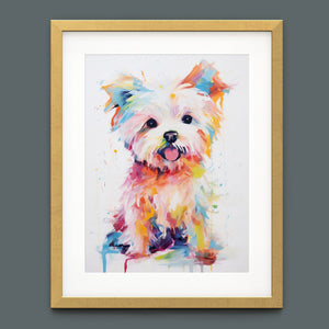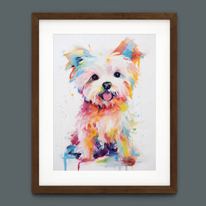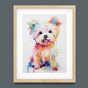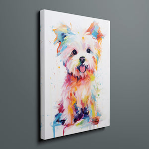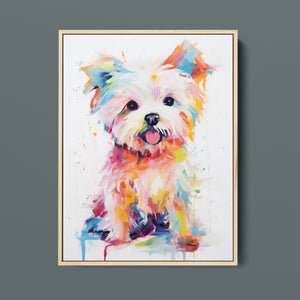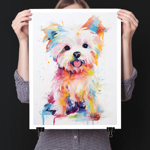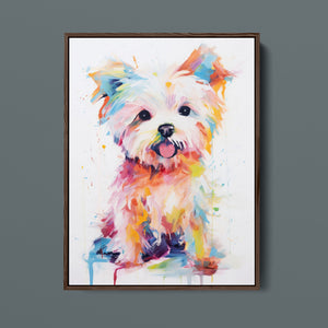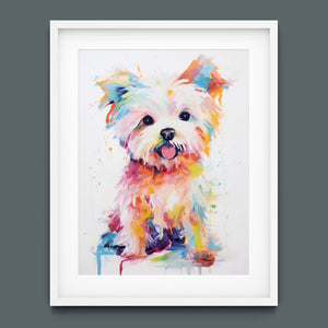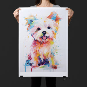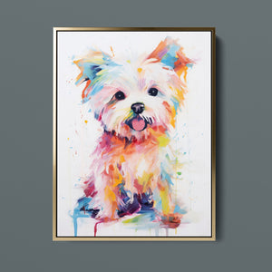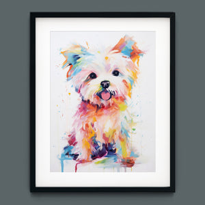Happy Painted Maltese Puppy showcases a bold and colorful portrait of a Maltese dog, highlighted by vibrant, abstract brushstrokes and bright tones. The artwork features joyful splashes of color and dripping paint, reflecting the pet's playful and cheerful nature. With a mix of vivid hues and expressive details, this contemporary piece celebrates the joyful spirit of the Maltese.