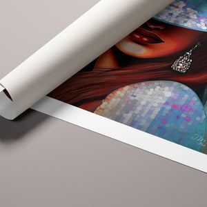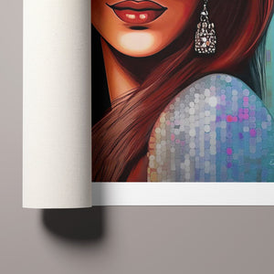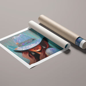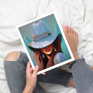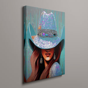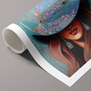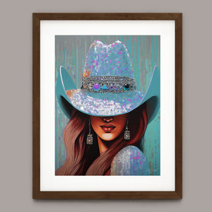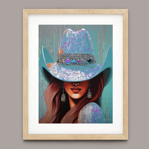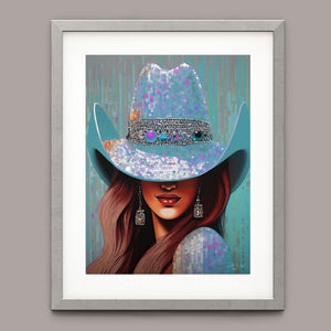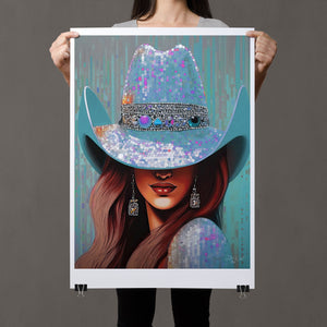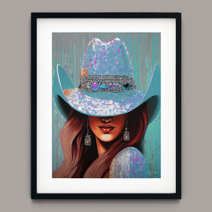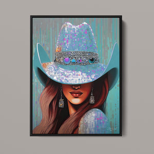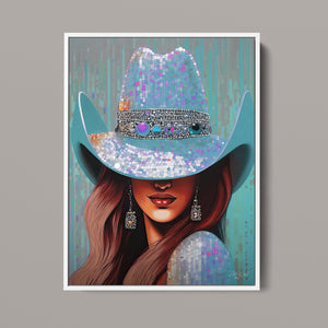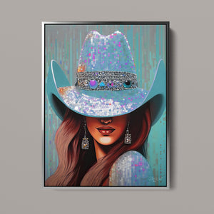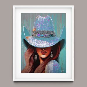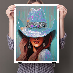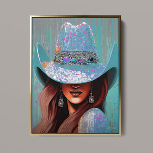 "Honky-Tonk Cowgirl - Blue" presents a striking portrait of a cowgirl in a colorful, rhinestone-studded outfit. This pop art painting highlights the joyful spirit of Western fashion, featuring a bold blue hat and sparkles that evoke the lively atmosphere of hoedowns, rodeos, and Southern festivities.