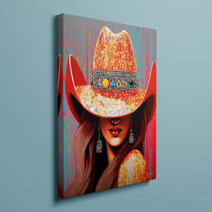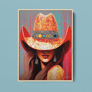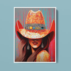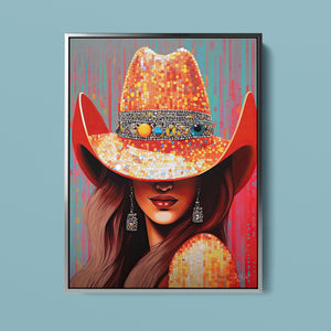 Vibrant cowgirl fashion painting in coral with rhinestones and sparkles, featuring bold Western style and pop art elements.