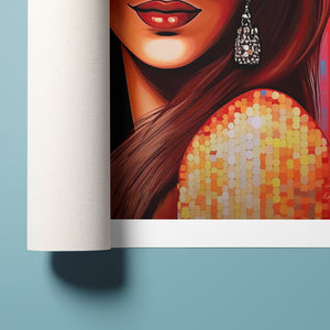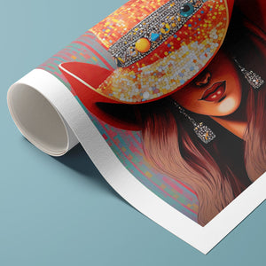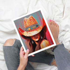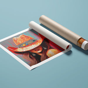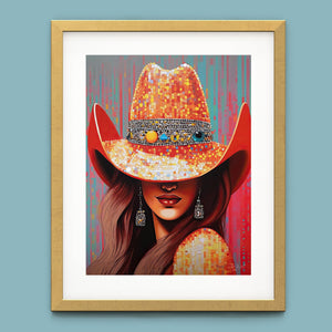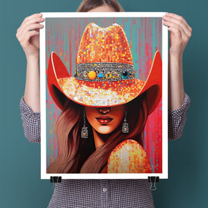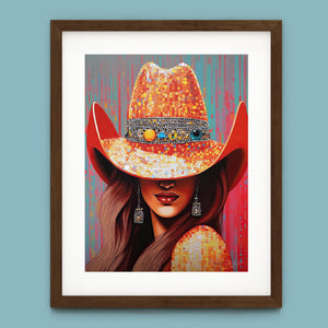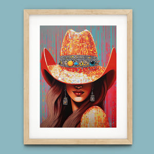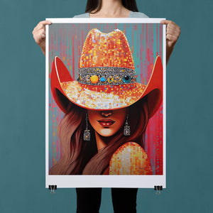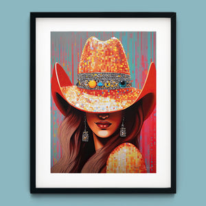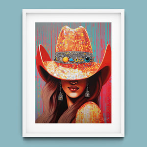 "Honky-Tonk Cowgirl - Coral" showcases a tall, colorful cowgirl with dazzling rhinestones and sparkles. This pop art piece celebrates Western fashion with a lively, creative twist, featuring star shapes and stripes that embody the fun and excitement of country hoedowns and rodeos.