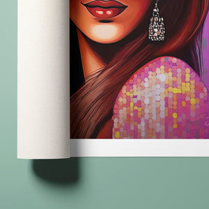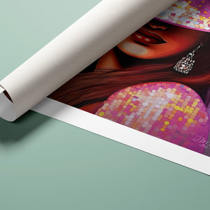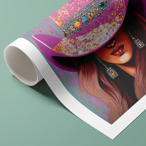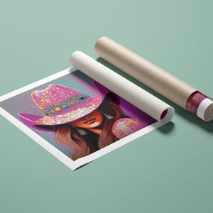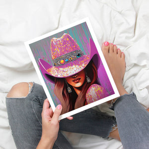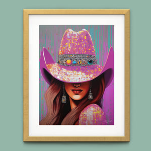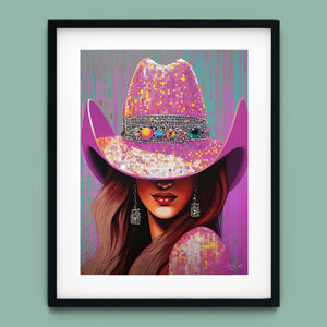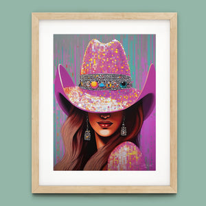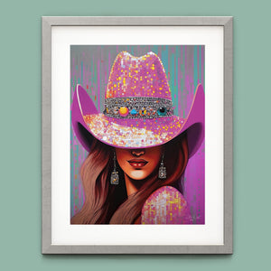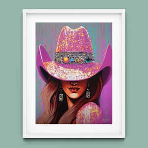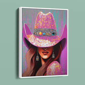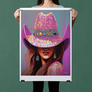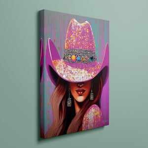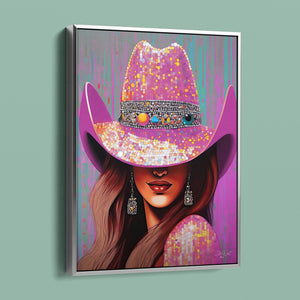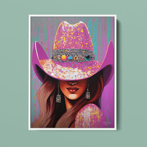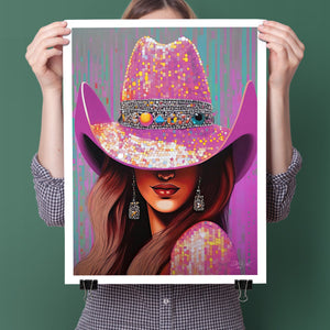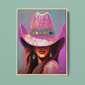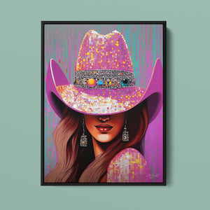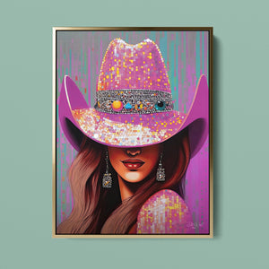 "Honky-Tonk Cowgirl - Pink" showcases a bold and colorful portrait of a cowgirl adorned with pink rhinestones and sparkles. This pop art painting radiates the joyful energy of Western fashion, highlighting a vibrant pink hat and playful details that evoke the fun of rodeos, hoedowns, and Southern charm.