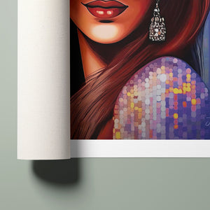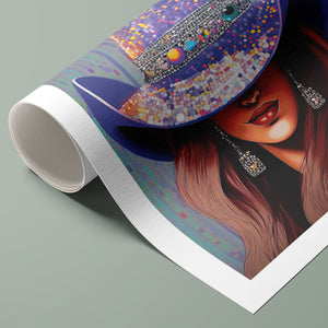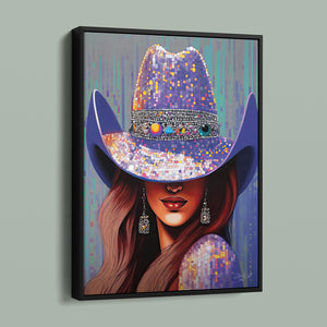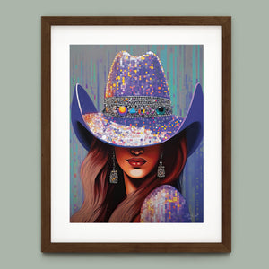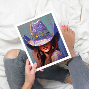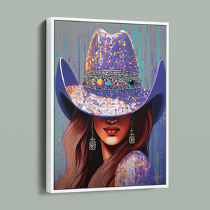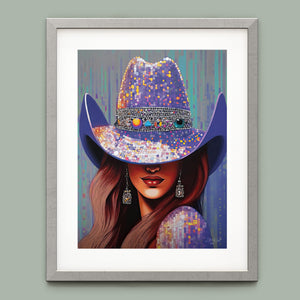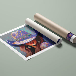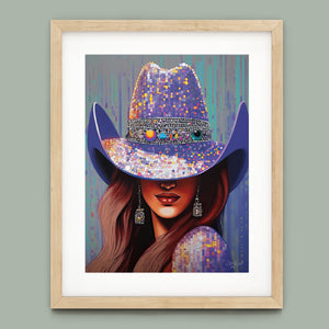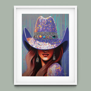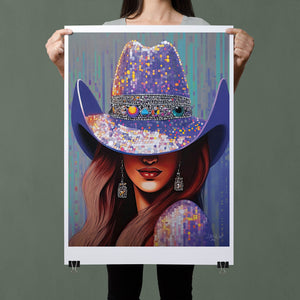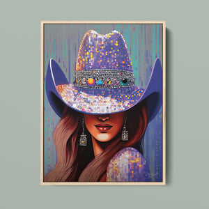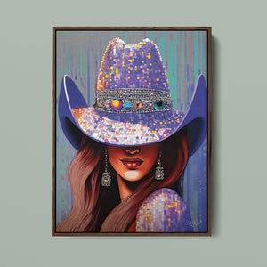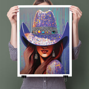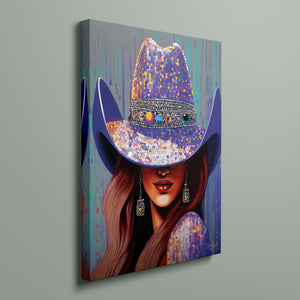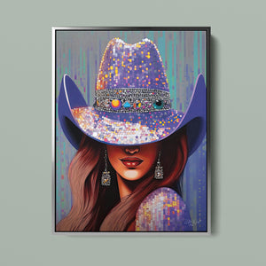 "Honky-Tonk Cowgirl - Purple" presents a lively and colorful portrait of a cowgirl in purple with sparkling rhinestones. This pop art painting highlights the playful and glamorous aspects of Western fashion, featuring a vibrant purple hat and lively details that celebrate rodeo and Southern style.