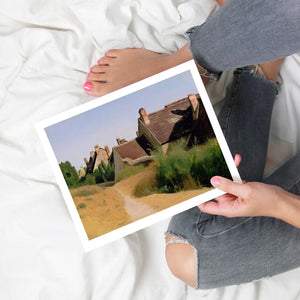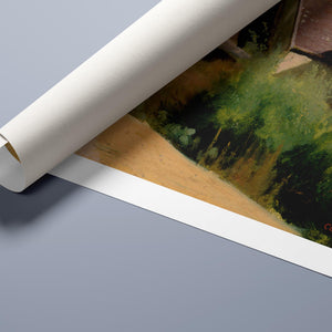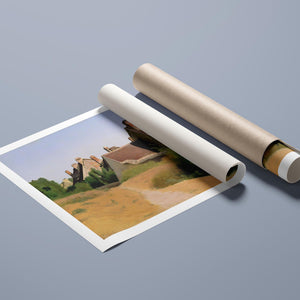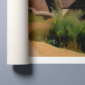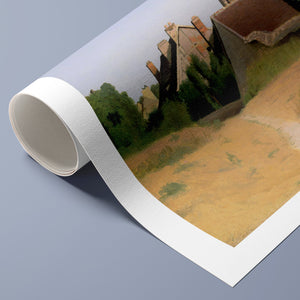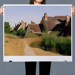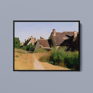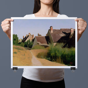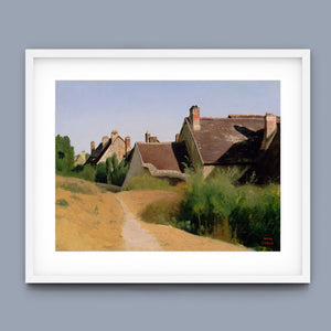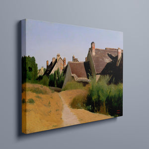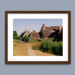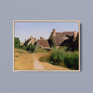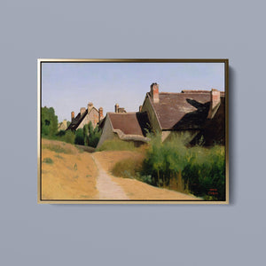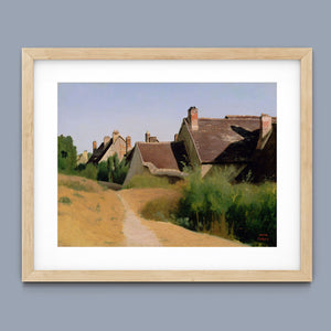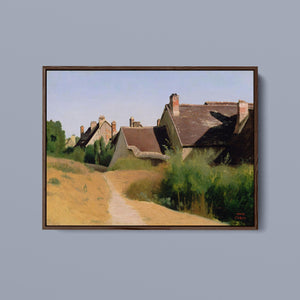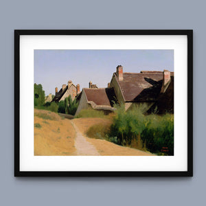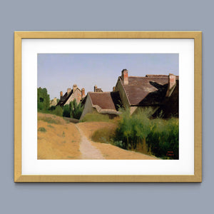 Discover Houses near Orléans - Maisons aux Environs d'Orléans by Jean-Baptiste Camille Corot, a classic 19th-century painting that beautifully depicts a tranquil rural landscape. The artwork showcases traditional village houses, a serene path, and lush greenery, capturing the idyllic essence of the French countryside in summer.