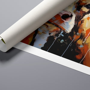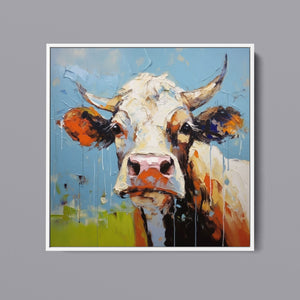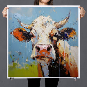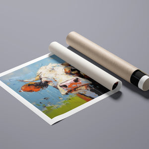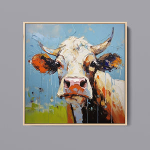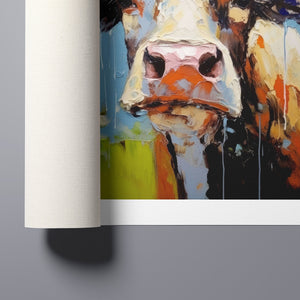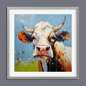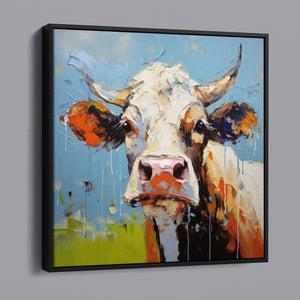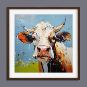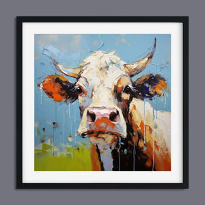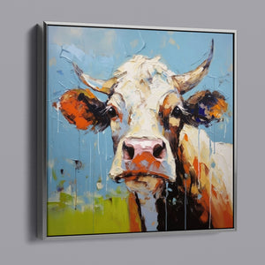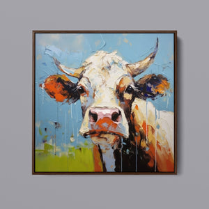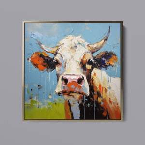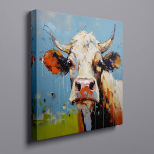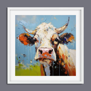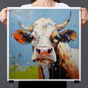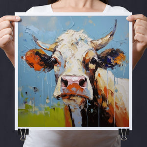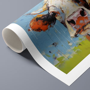 Immerse yourself in the vibrant world of rural Americana with "Impasto Farms - Bulled And Colorful." This contemporary art piece, rendered in bold strokes of oil paint, features a striking bovine subject set against a pastoral backdrop. The impasto technique brings a textured, dynamic quality to the canvas, highlighting the rich hues of blue, green, and yellow. Ideal for gallery display or adding a lively touch to farmhouse decor, this painting captures the essence of the countryside with a modern, abstract flair.