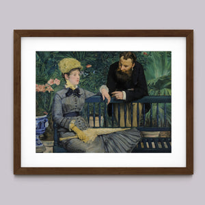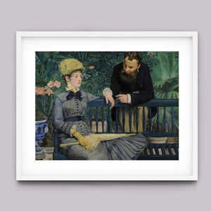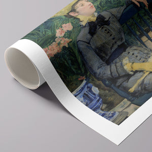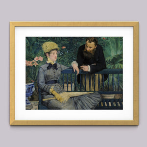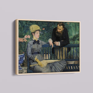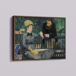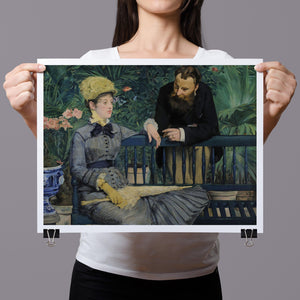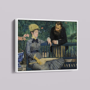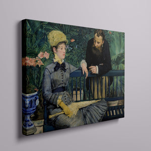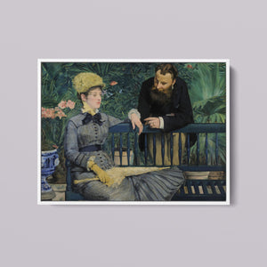 Immerse yourself in the opulent world of In the Conservatory, a 19th-century Impressionist painting capturing a refined couple in an indoor garden. The artwork beautifully depicts a seated woman and a standing man amidst lush greenery and colorful flowers, rendered with elegant attire and a serene interaction. This classic piece reflects the leisure and cultural sophistication of the Victorian era, offering a glimpse into the artistry and elegance of the period.