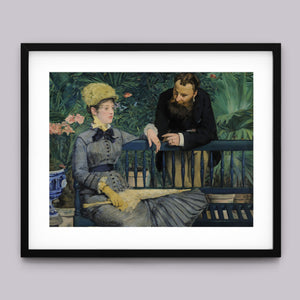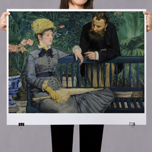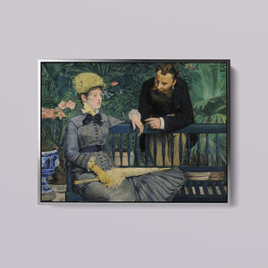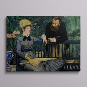 19th-century Impressionist painting of an elegant couple in a lush indoor garden, showcasing vibrant greenery and Victorian-era attire.
