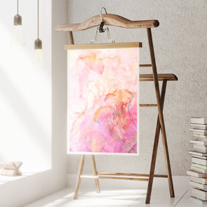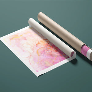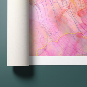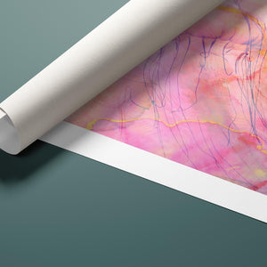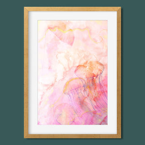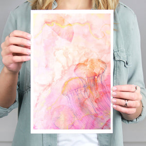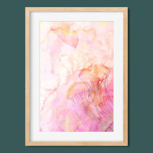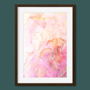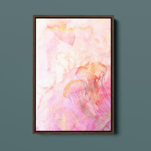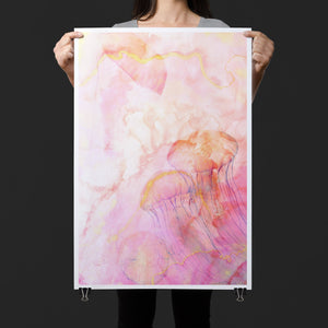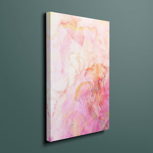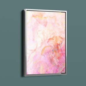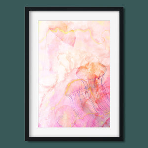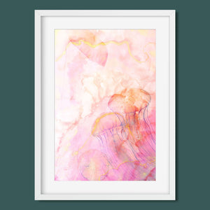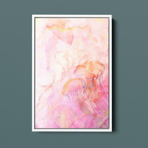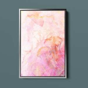 "Jellyfish" is a mesmerizing modern art piece that captures the fluid and ethereal beauty of jellyfish in a captivating blend of pink, white, rose gold, and yellow hues. The flowing, abstract depiction mimics the natural underwater movement of these creatures, creating a pastel-colored backdrop that radiates serenity. This watercolor and ink artwork offers a dynamic, textured portrayal of marine life, making it a perfect addition to any coastal or nature-themed space.