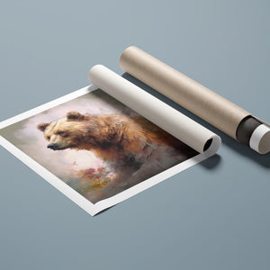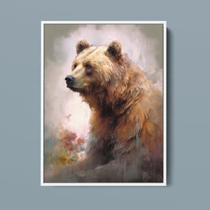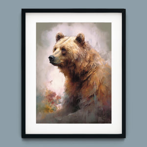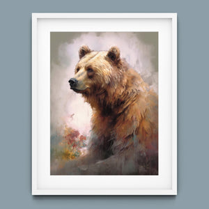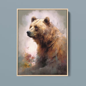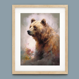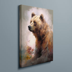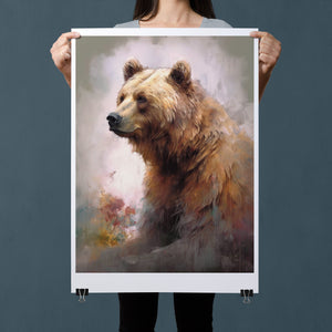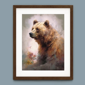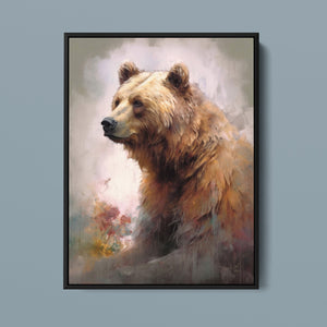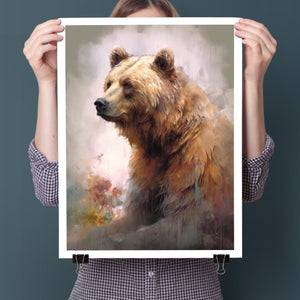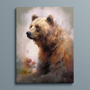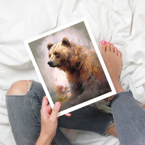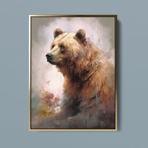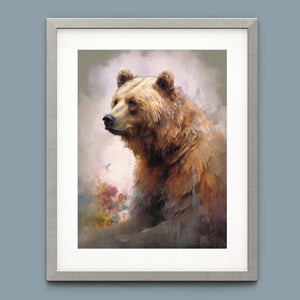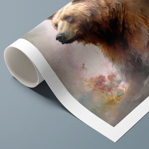 "Kodiak King" presents a grizzly bear in a modern watercolor style, illustrating its regal stature in the Rocky Mountains. The artwork employs subtle pastel colors to capture the bear’s majesty and the tranquil surroundings of lakes, streams, and pine trees.