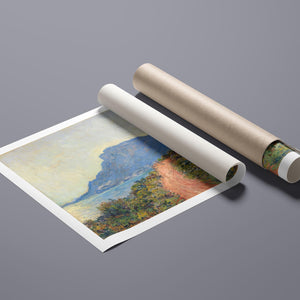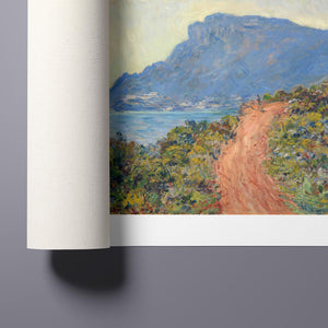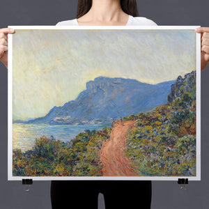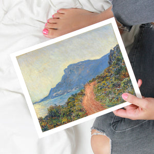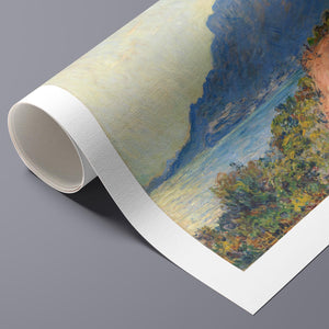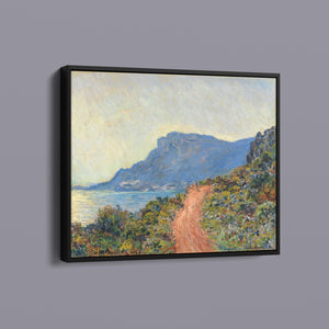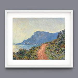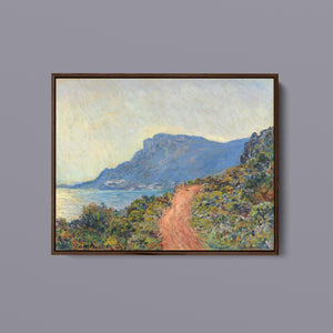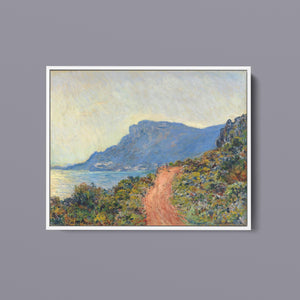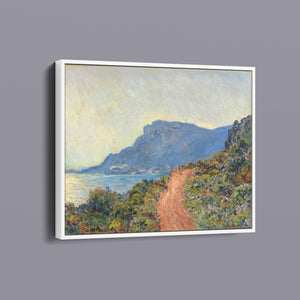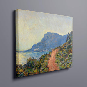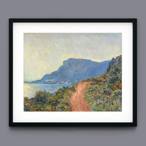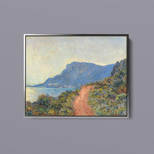 "La Corniche Near Monaco" by Claude Monet is a remarkable Impressionist painting created in 1884. The artwork portrays a breathtaking view of the Mediterranean coastline near Monaco, with its dramatic cliffs and sparkling blue waters. Monet’s use of vibrant colors and loose brushstrokes vividly captures the essence of the seascape, emphasizing the interplay of light and shadow on the rugged terrain and the tranquil sea. The painting highlights Monet’s skill in rendering the dynamic effects of natural light and his innovative approach to capturing the scenic beauty of the Mediterranean. Through this work, Monet offers a serene yet striking depiction of the coastal landscape, reflecting his profound connection to and admiration for nature.