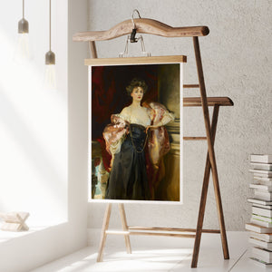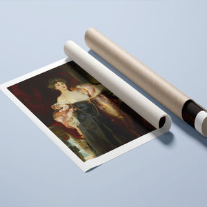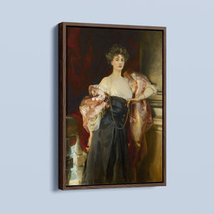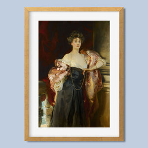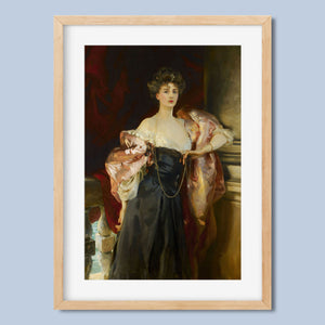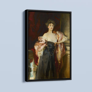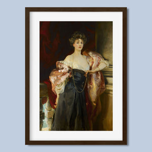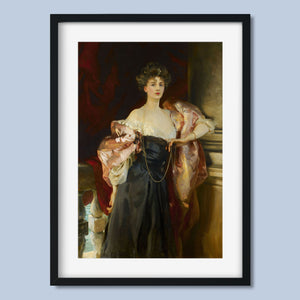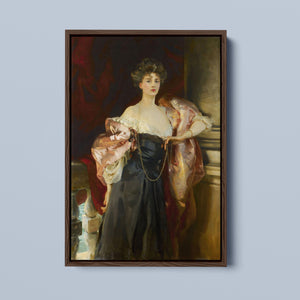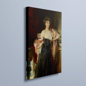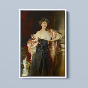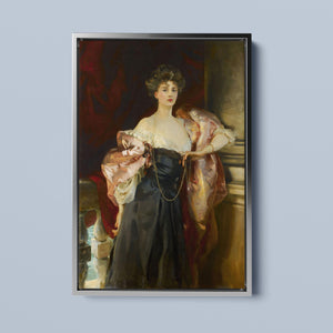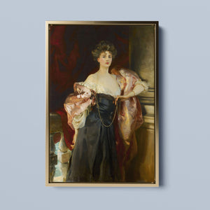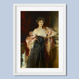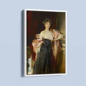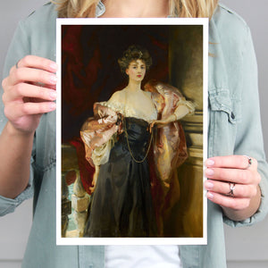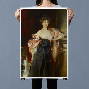 This striking 1904 portrait by John Singer Sargent captures Lady Helen Vincent, Viscountess d'Abernon, embodying the elegance and sophistication of the Edwardian era. The vertical composition highlights her in a luxurious gown of white, navy, and rose gold, with intricate details in silk and velvet. Adorned with pearls and fine jewelry, Lady Helen exudes grace and opulence, reflecting the high society and aristocratic culture of the time. Sargent's masterful brushwork and attention to detail showcase the refined beauty and affluent style of early 20th-century fashion.