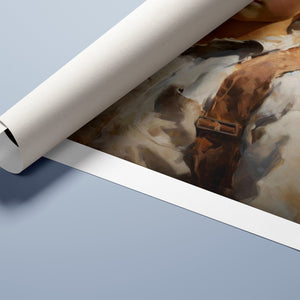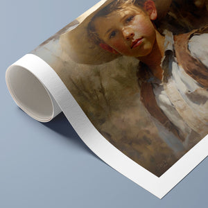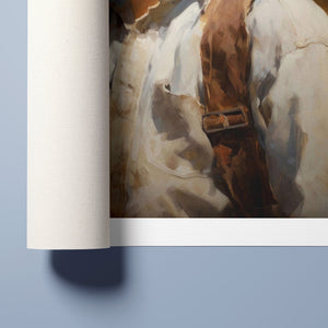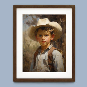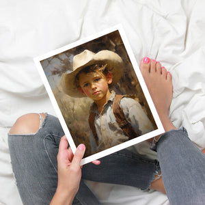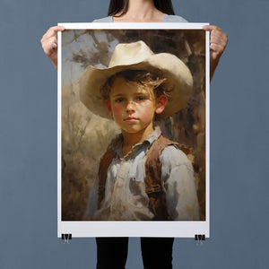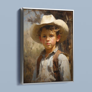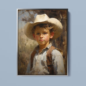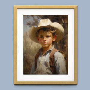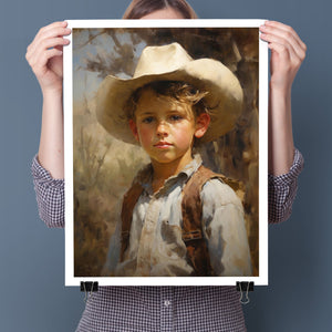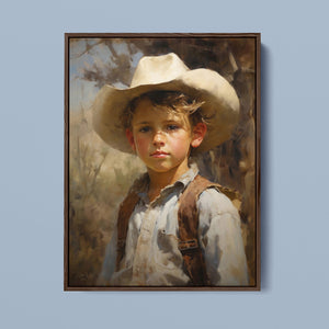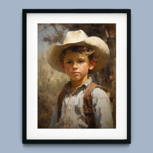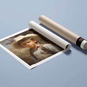 "Lariat" portrays a young boy in vintage cowboy attire, embodying the rugged charm of the American West. This oil painting celebrates the nostalgic and endearing spirit of childhood, making it a perfect addition to any collection of Western and Americana art.
