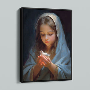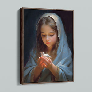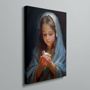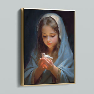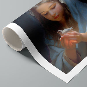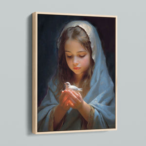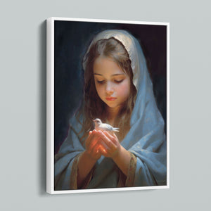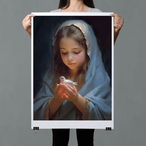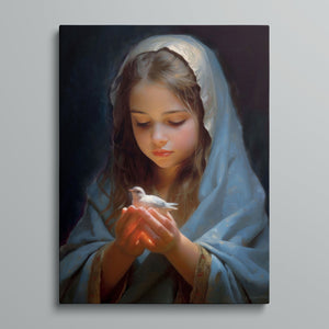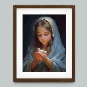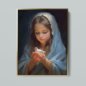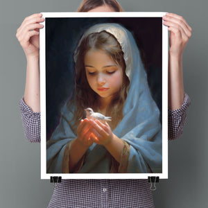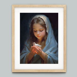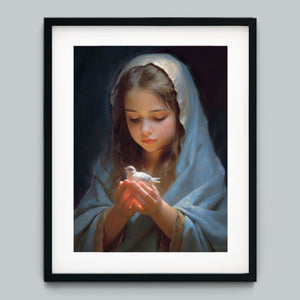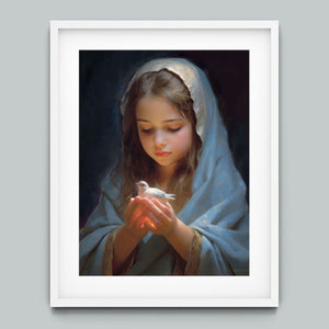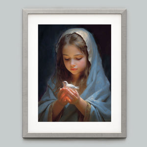 Inspirational painting of a child praying with a small white bird, featuring soft colors and gentle light, capturing a moment of reverence and compassion.