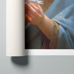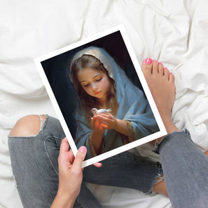 Experience the serenity and compassion of Least Of These, a spiritual artwork depicting a child in a moment of reverent contemplation with a small bird. This ethereal painting, rendered in soft blues, browns, and whites, highlights the innocence and tenderness of the scene, capturing the gentle purity and warmth of the child’s interaction with nature. Ideal for those who appreciate spiritual and inspirational art.