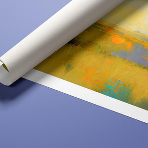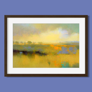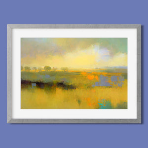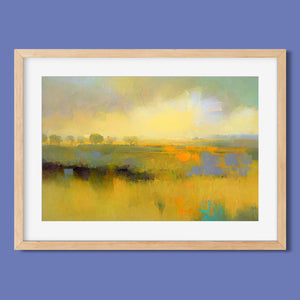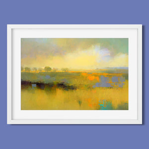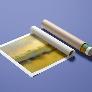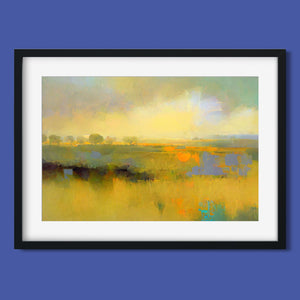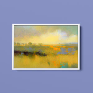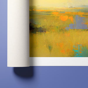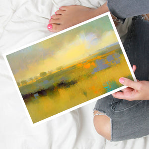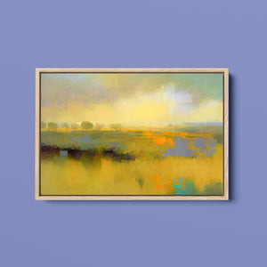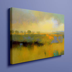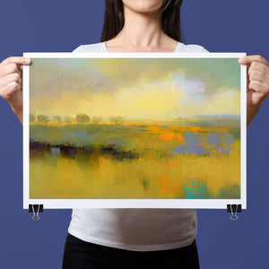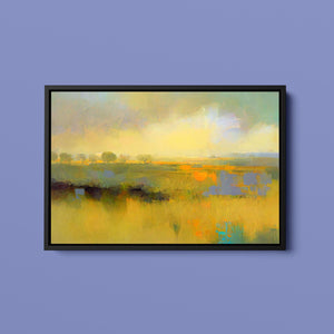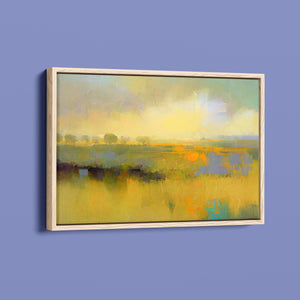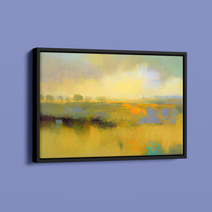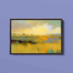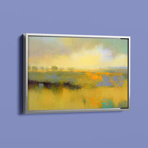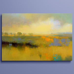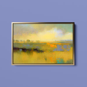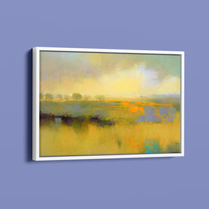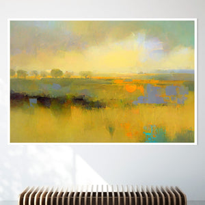"Light Morning Rain" beautifully depicts the serene atmosphere of a tranquil sunrise after a gentle rain. This abstract landscape artwork showcases soft pastel tones of yellow, green, and orange, creating a harmonious balance that reflects the calming essence of nature. The subtle play of light and water enhances the impressionistic quality of the scene, inviting viewers to experience the peaceful beauty of dawn in a lush field.