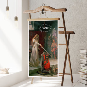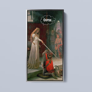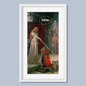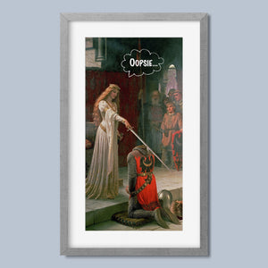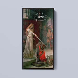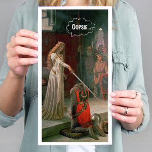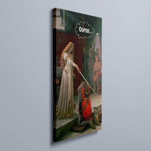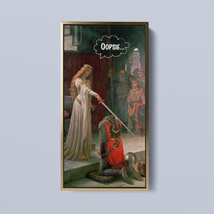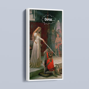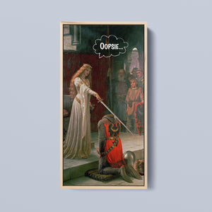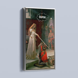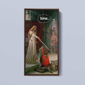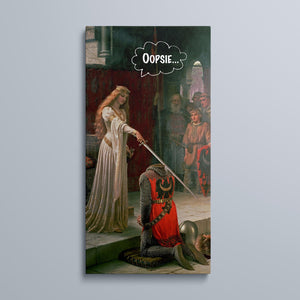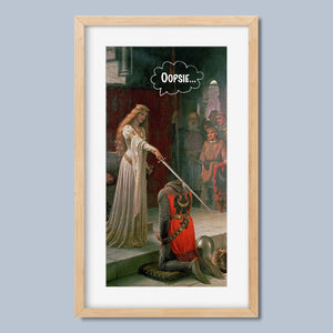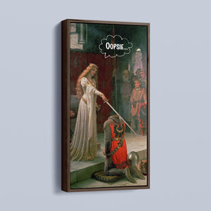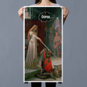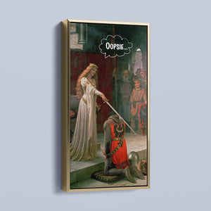 "Loosing My Head Meme - Oopsie" is a whimsical and captivating vintage portrait that reimagines classical art with a playful twist. This vertical artwork features a mysterious woman adorned in a blue dress with elegant gold accents, her face partially concealed by a stunning butterfly mask. The surreal blend of vibrant colors, including rich browns and reds, brings a sense of depth and intrigue. With elements of 18th-century fashion and playful fantasy, this piece invites viewers to explore the fusion of nature and humanity, evoking a sense of aristocratic elegance and creativity.