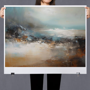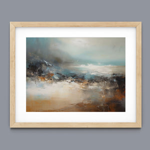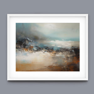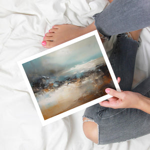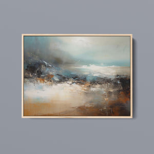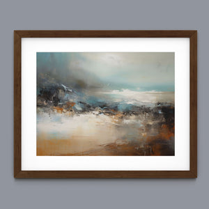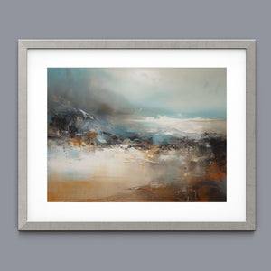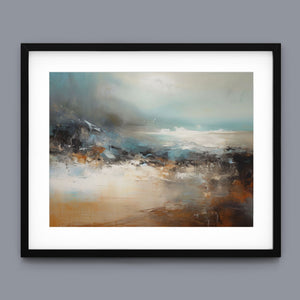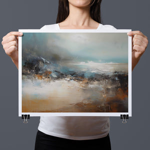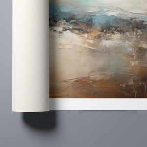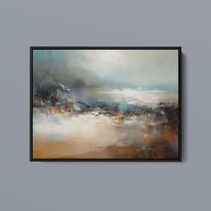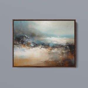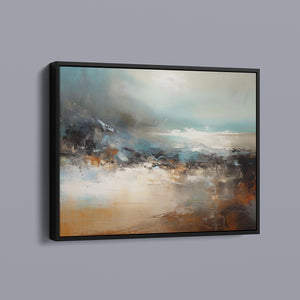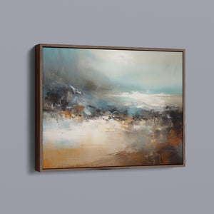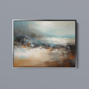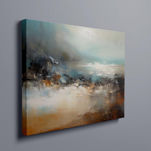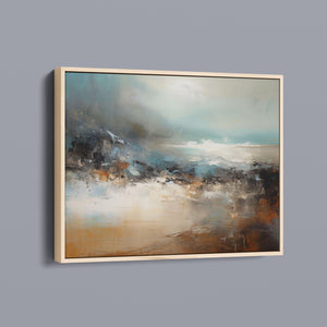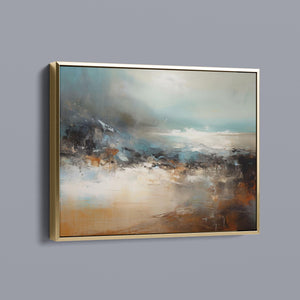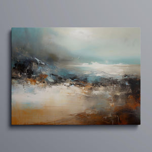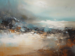 Love on the Rocks is an evocative abstract painting that explores the interplay of romance and nature along a rocky shore. The 4x3 canvas is filled with textured brushstrokes in blue, gray, and brown tones, reflecting the tumultuous yet serene essence of the sea. The splashing waves and rugged coastline create a dynamic coastal scene, while the muted colors convey a sense of tranquility and affection. This artwork is perfect for those who appreciate the emotional depth and natural beauty of contemporary coastal decor.