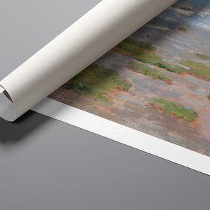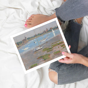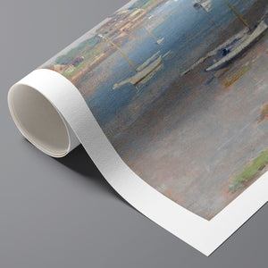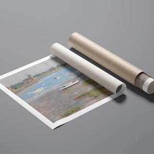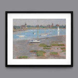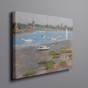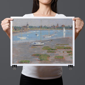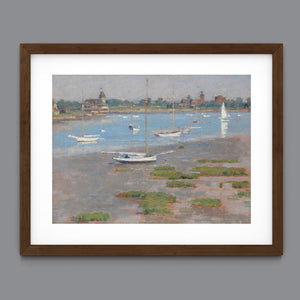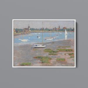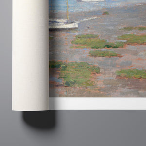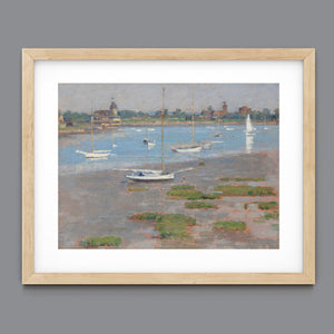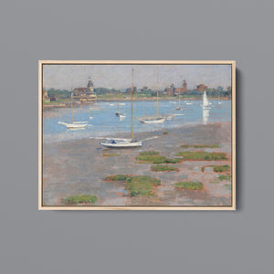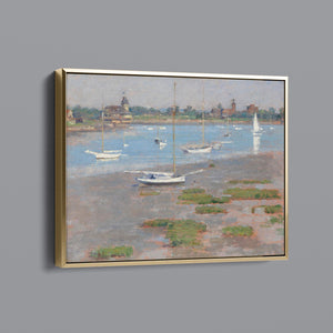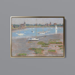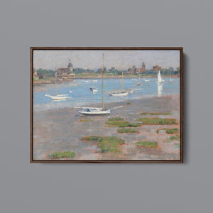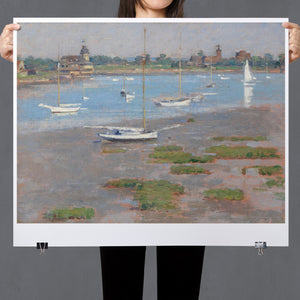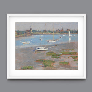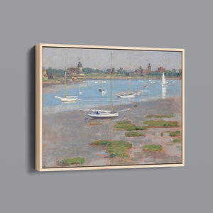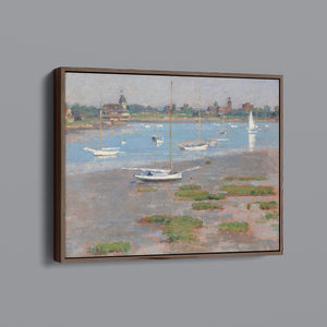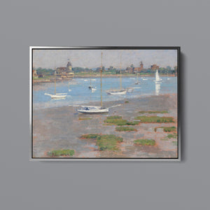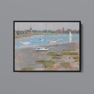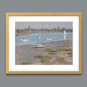 Experience Low Tide, Riverside Yacht Club 1894 by Theodore Robinson, a classic 19th-century impressionist painting that beautifully depicts a peaceful coastal scene. The artwork features yachts and boats moored at low tide in a New England harbor, rendered in pastel colors and capturing the tranquil essence of maritime leisure and reflection.