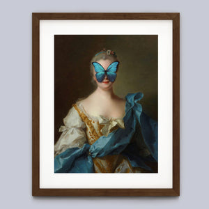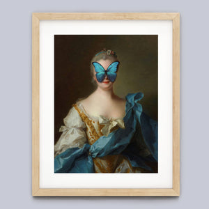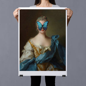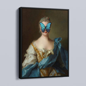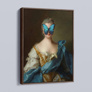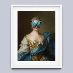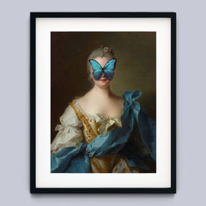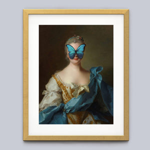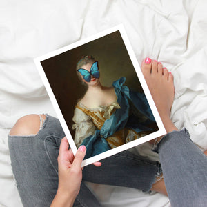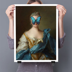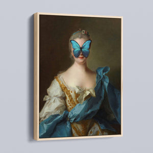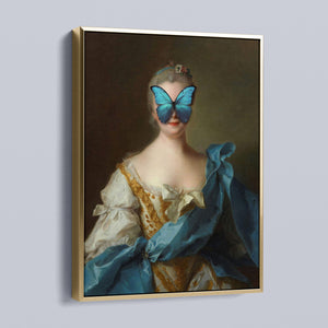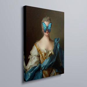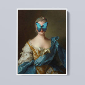 Madame Butterfly Blue Gold is a captivating altered portrait that combines the Gothic allure of dark, mysterious elements with the refined elegance of classic European art. The 3x4 canvas showcases a pale, enigmatic woman seated in a vintage setting, her intense gaze and dignified posture enhanced by deep blue, gold, and beige tones. With its eerie shadows, crimson accents, and a hint of the supernatural, this piece evokes a sense of brooding mystery and supernatural intrigue. Perfect for those who appreciate art that blends historical elegance with a moody, emotional depth, this portrait is a striking addition to any collection.