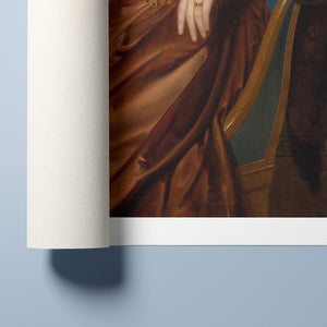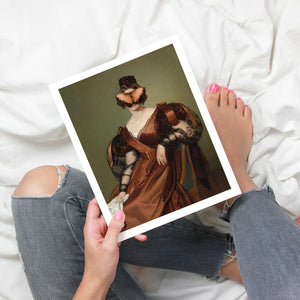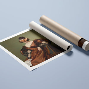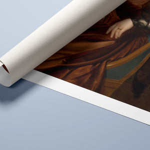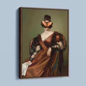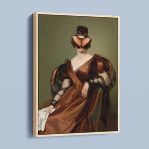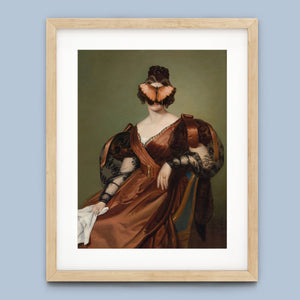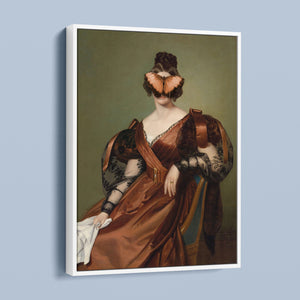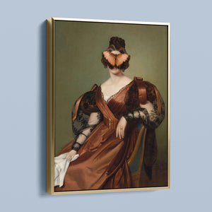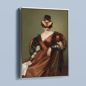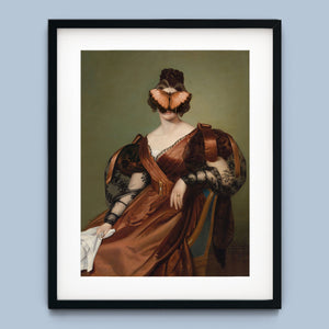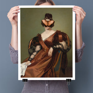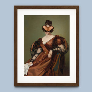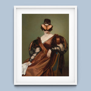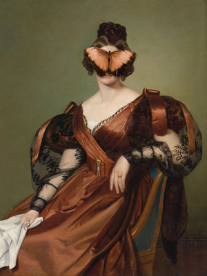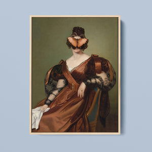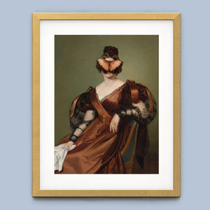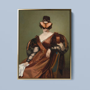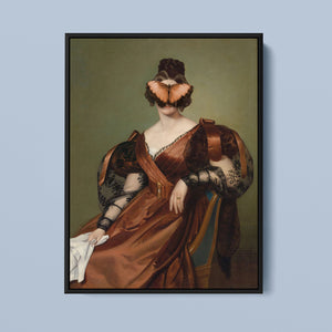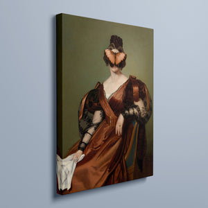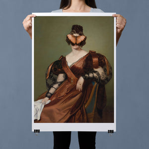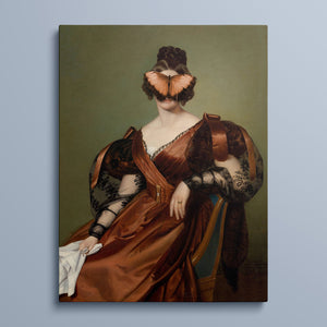 Madame Butterfly - Brown - Full is a stunning altered portrait that captures the luxurious elegance of historical fashion with a modern twist. The 3x4 canvas showcases a poised woman in a blue satin dress, her regal posture complemented by a delicate butterfly mask and ornate gold jewelry. The rich red, bronze, and brown tones create a warm, opulent atmosphere, evoking the sophistication of aristocratic interiors. The intricate details, from the delicate lace to the vibrant color scheme, reflect a fusion of classic and contemporary art, making this piece a perfect choice for those who appreciate the grandeur of 19th-century style with a modern edge.
