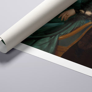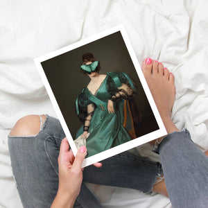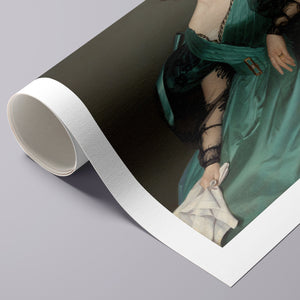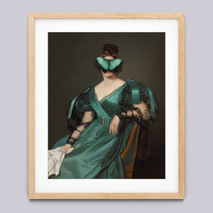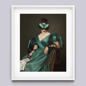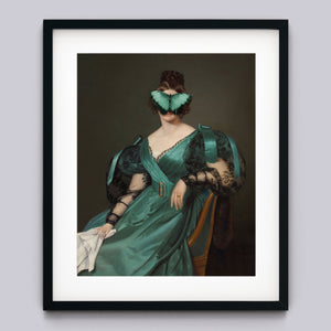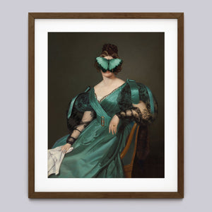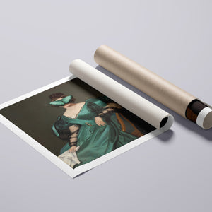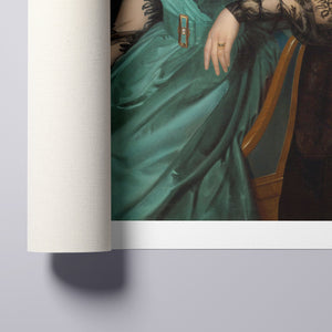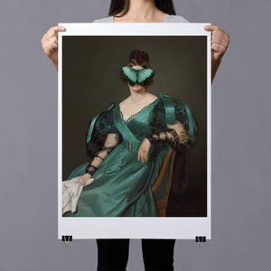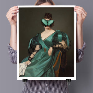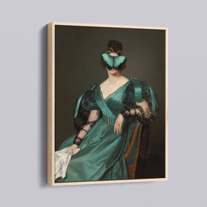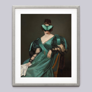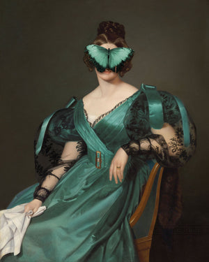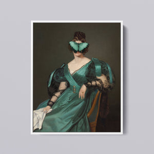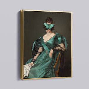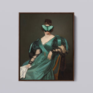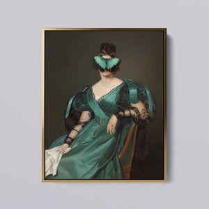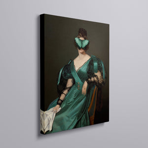 "Madame Butterfly - Jade" is an exquisite 4x5 vertical portrait showcasing the elegance of 18th-century Rococo style. The painting features a dignified female figure in a blue and gray satin gown, adorned with intricate lace, pearls, and a feathered headdress. With its pastel colors and delicate depiction of powdered wig and ornate jewelry, this oil on canvas artwork exudes historical opulence and refined grace. Ideal for those who appreciate vintage fashion and classic art, this piece adds a touch of cultural sophistication and artistic beauty to any collection or interior.