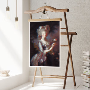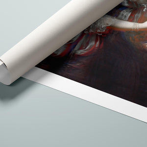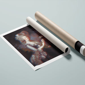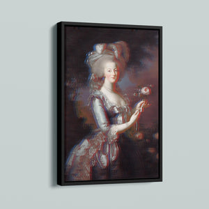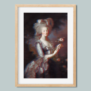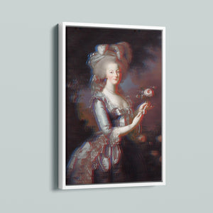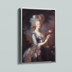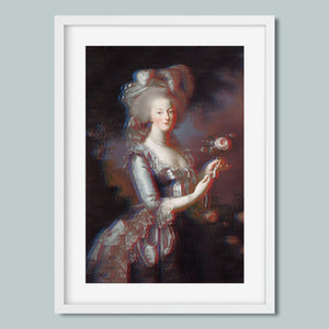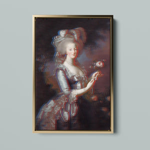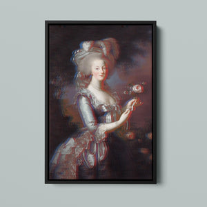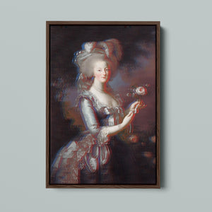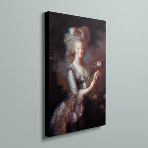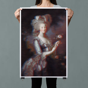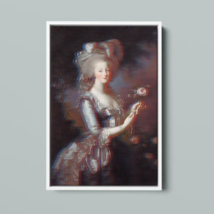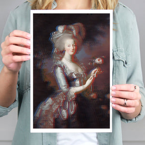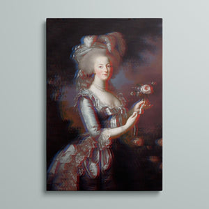 "Madame Butterfly - Marie Antoinette - GLiTcH" is a captivating portrait that blends vintage elegance with a touch of modern distortion. This piece features a sophisticated woman draped in a sumptuous gown with intricate detailing. The portrait's color palette of gray, white, pink, and rose gold highlights the opulence of her attire, while elements like a butterfly mask and delicate feathered accessories add a layer of mystery and grace. The vintage charm is enhanced by classical references and artistic flair, making it a striking blend of historical and contemporary aesthetics.