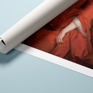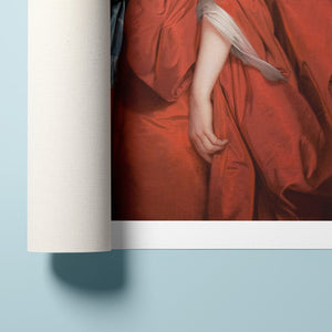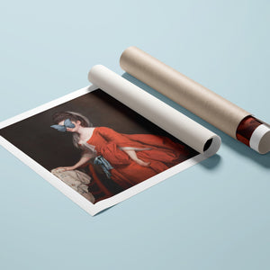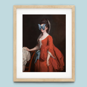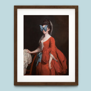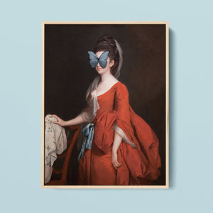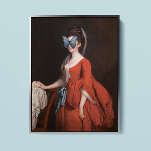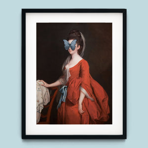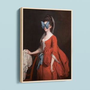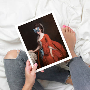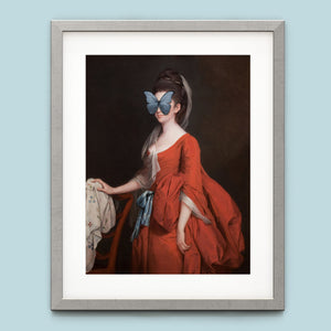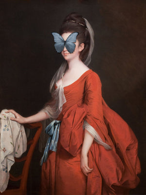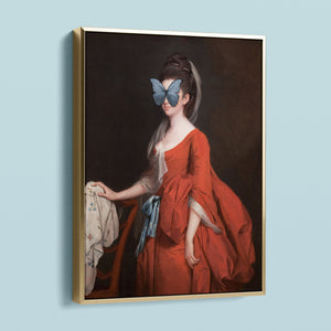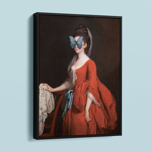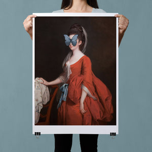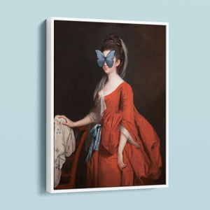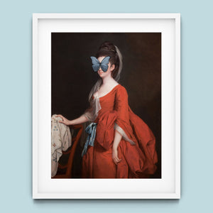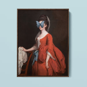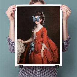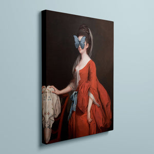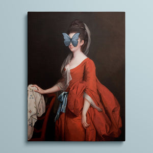 Madame Butterfly - Red Dress Grey Butterfly is an exquisite altered portrait that fuses the opulence of historical fashion with a touch of mysterious charm. The 3x4 canvas depicts a refined woman in a rich red dress, her face partially obscured by a grey butterfly mask. The combination of deep red, black, and blue tones adds depth to her elegant pose, while intricate details like black lace, ornate patterns, and a fan in hand highlight the sophistication of high-society fashion. This piece is perfect for those who appreciate vintage aesthetics infused with an enigmatic, Victorian allure, making it a timeless addition to any art collection.