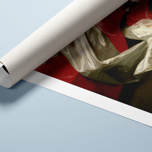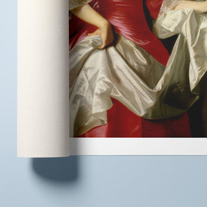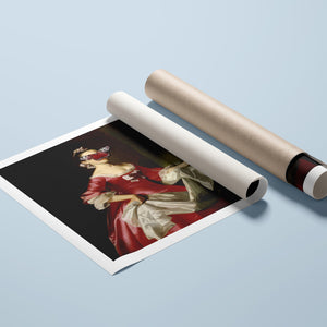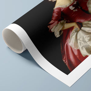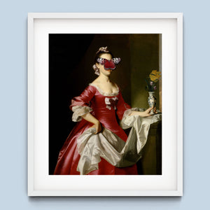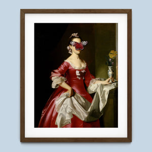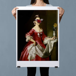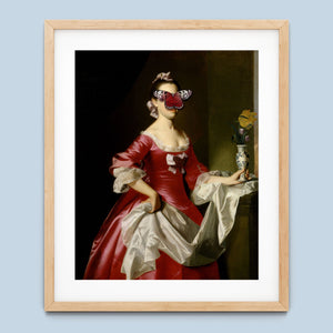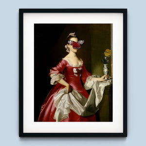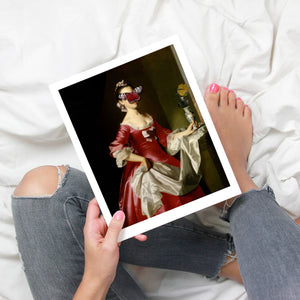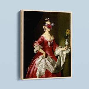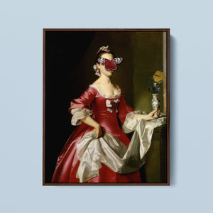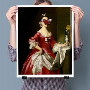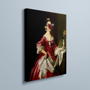 "Madame Butterfly - Ruby" is a captivating 4x5 vertical portrait that merges vintage charm with Victorian surrealism. The painting features an elegant woman seated in an ornate chair, dressed in a rich red gown, and adorned with a unique insect mask. The artwork's muted tones and classical elements, such as a green background and detailed decoration, evoke a sense of sophistication and mystery. Ideal for adding a touch of historical fashion and imaginative artistry to your decor, this piece offers a refined blend of style and enigmatic grace.