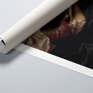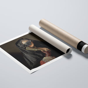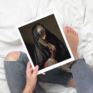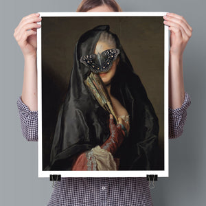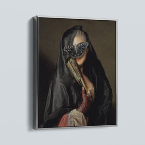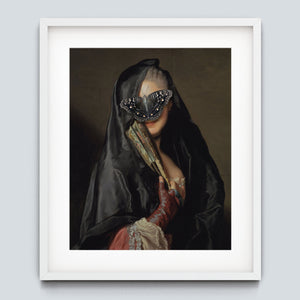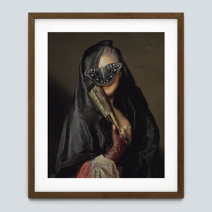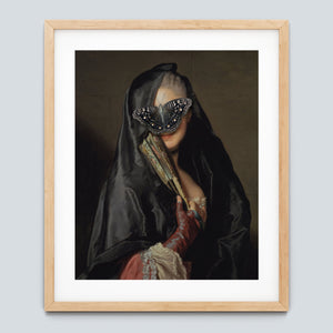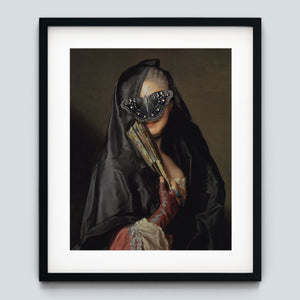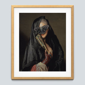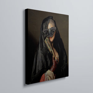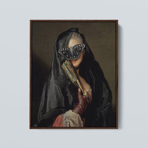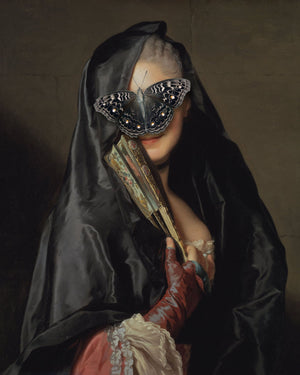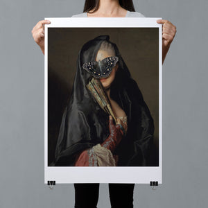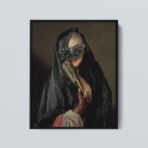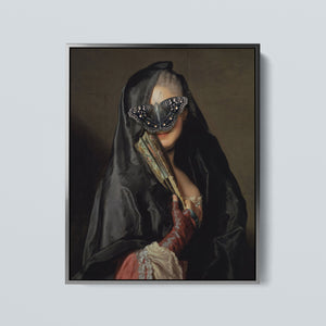 "Madame Butterfly - The Lady with the Veil" is a stunning 4x5 vertical portrait that combines vintage elegance with surreal sophistication. The painting showcases a refined woman in a blue evening dress, adorned with a butterfly mask and holding a book, set against a backdrop of dark clouds and velvet fabric. Her dark curls and antique brooch add to the ethereal and mysterious ambiance. This fine art piece, with its rich textures and classical 19th-century style, offers a blend of historical charm and artistic depth, perfect for enhancing any collection or interior with a touch of surreal sophistication.